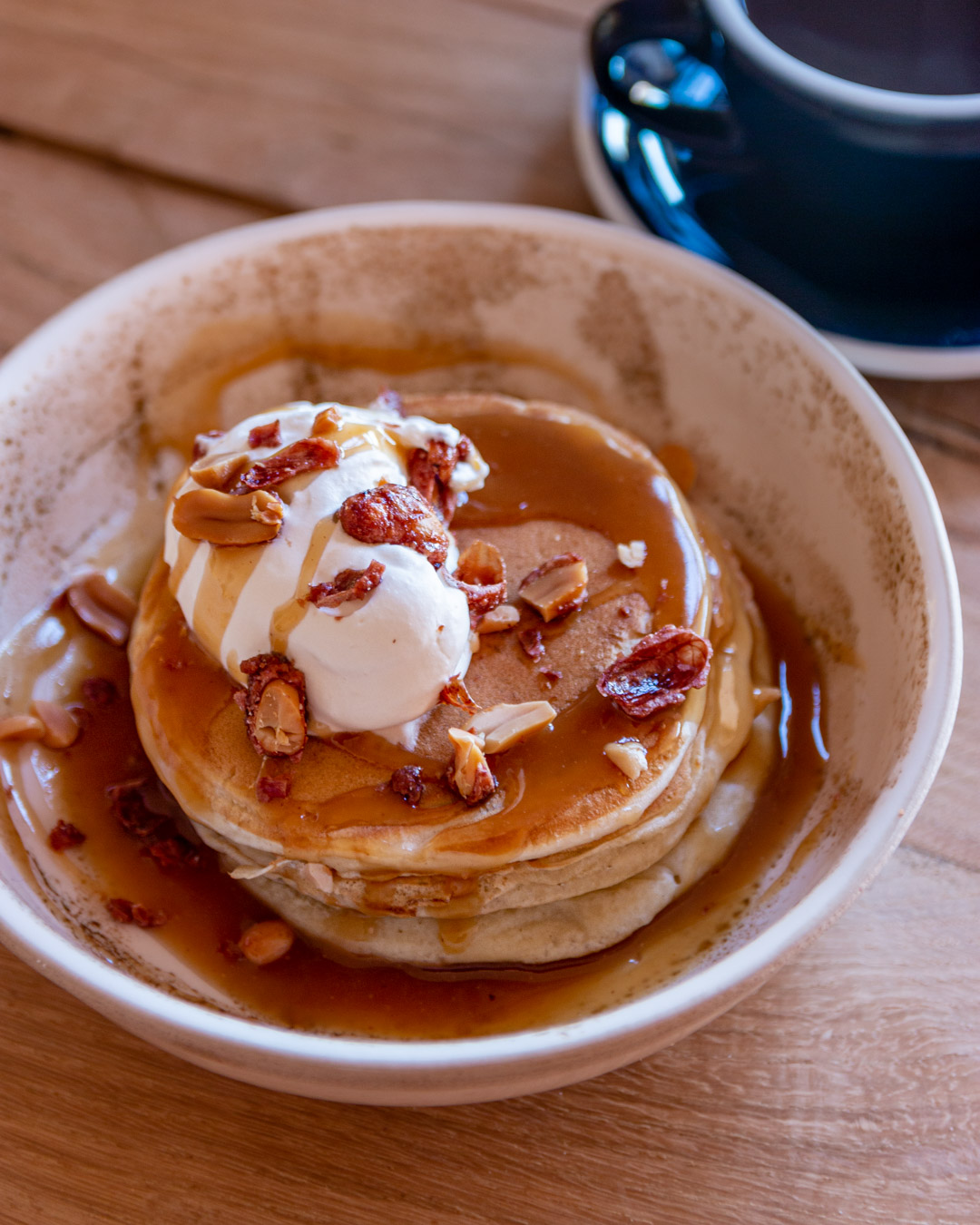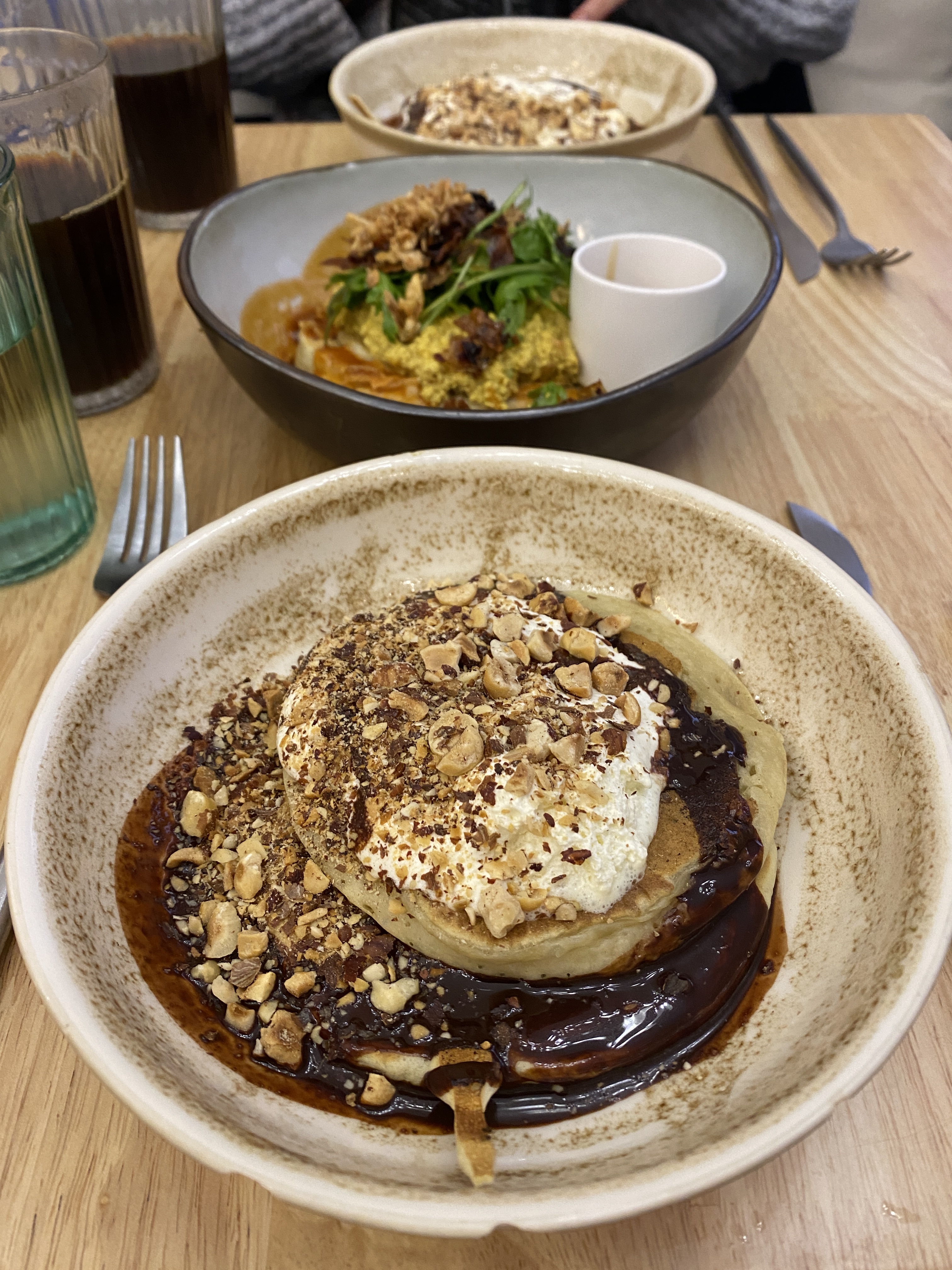 Top! Découvert au hasard, peanut butter latte avec cookie façon banana bread! Les pancakes délicieux aussi!