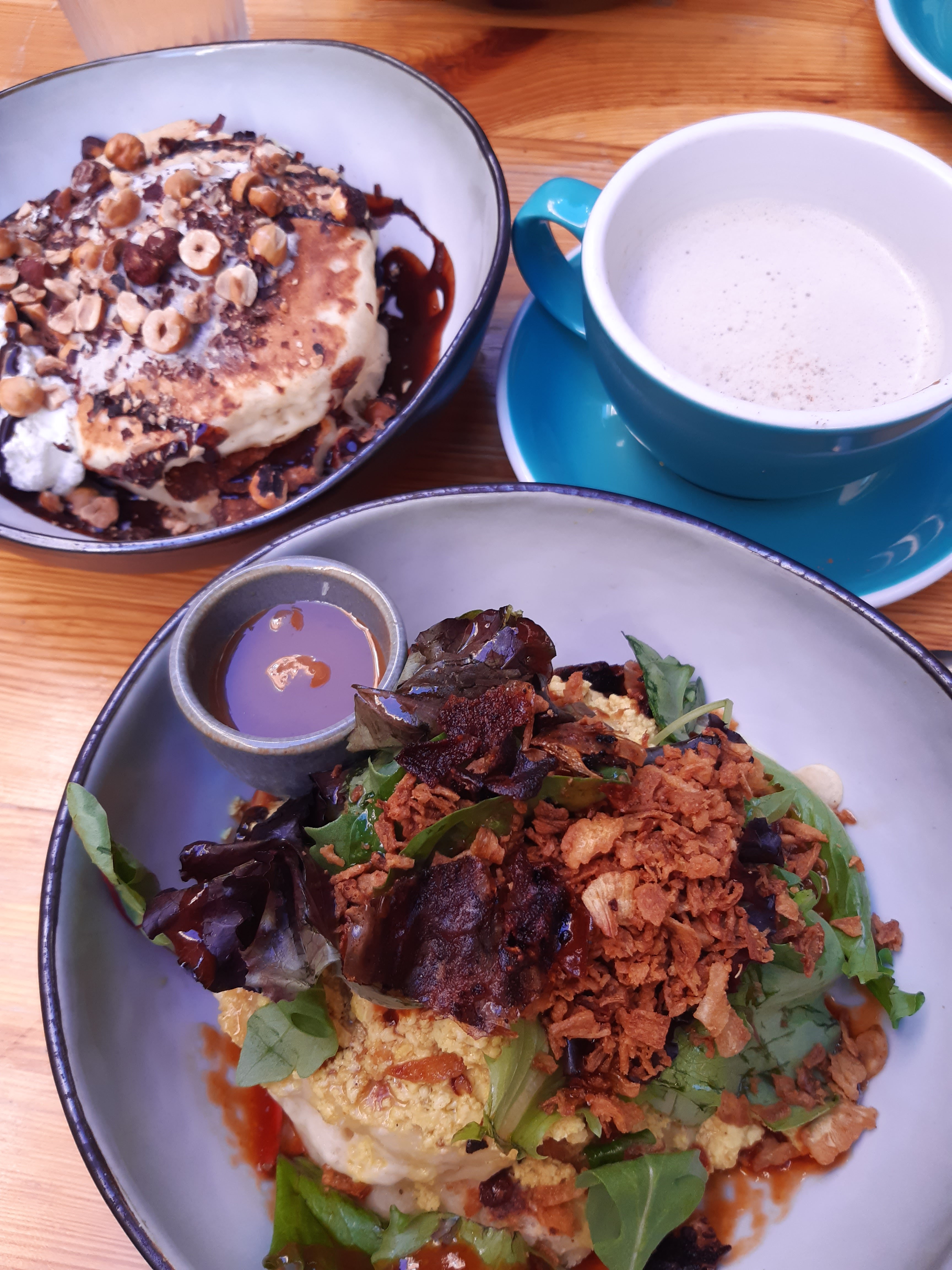 Nous avons eu la chance de venir bruncher dans ce petit café restaurant. Tout était vraiment excellent. Nous avons goûté le kebab vegan qui était vraiment exqui, et les pancakes sucrés et salés qui étaient très fluffy et généreux. Nous reviendrons avec grand plaisir ! Le seul petit bémol est le manque de place en salle ce qui entraîne un peu d'attente. Mais croyez-moi, l'attente en vaut le coup !