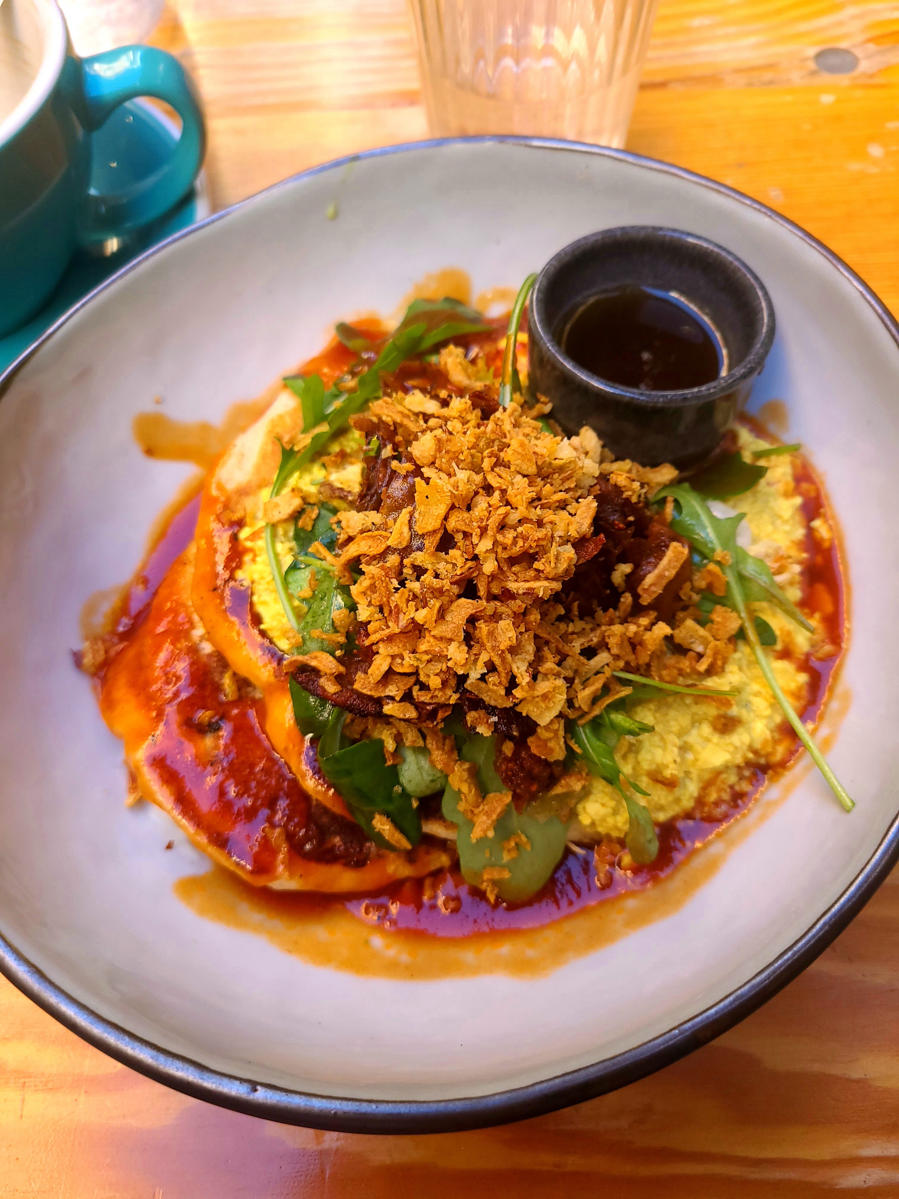 Ne sortez JAMAIS les pancakes salés de la carte svp 😩 Le meilleur brunch vegan de Toulouse, j’essaie de tester les nouveautés à chaque fois, mais ces pancakes avec le tofu brouillés, le bacon maison et la sauce cacahuètes… incroyable 🥹