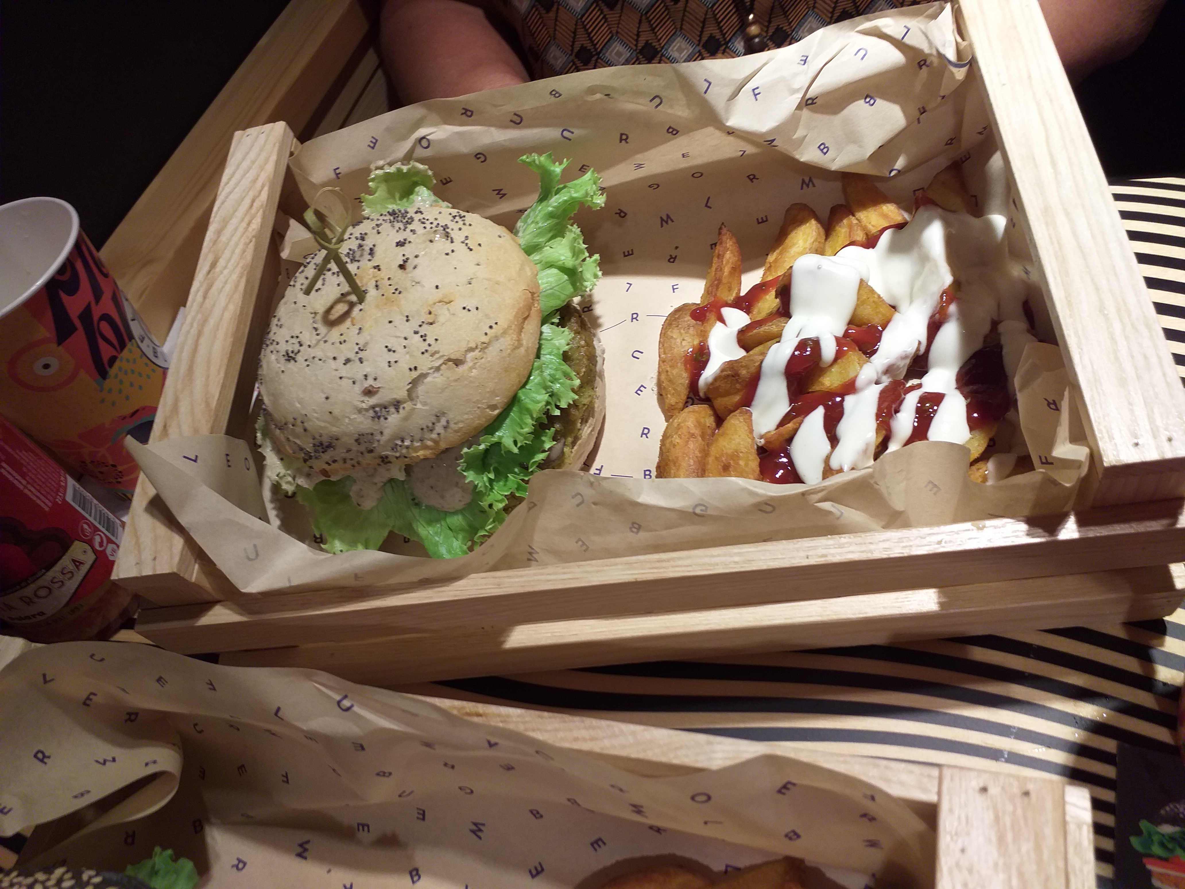 Déçue : les photos, le lieu et le concept (burger vegan beau au prix abordable) me faisaient saliver. J'ai aimé le burger avec steak de seitan et haricots rouges, mais malheureusement même si c'est vegan ce n'est pas de la qualité pour autant. Les potatoes sont sûrement des McCain surgelées, qui m'ont donné mal au ventre toute la soirée, j'ai très mal digéré le repas. Ça me paraît finalement être plus du marketing qu'autre chose...