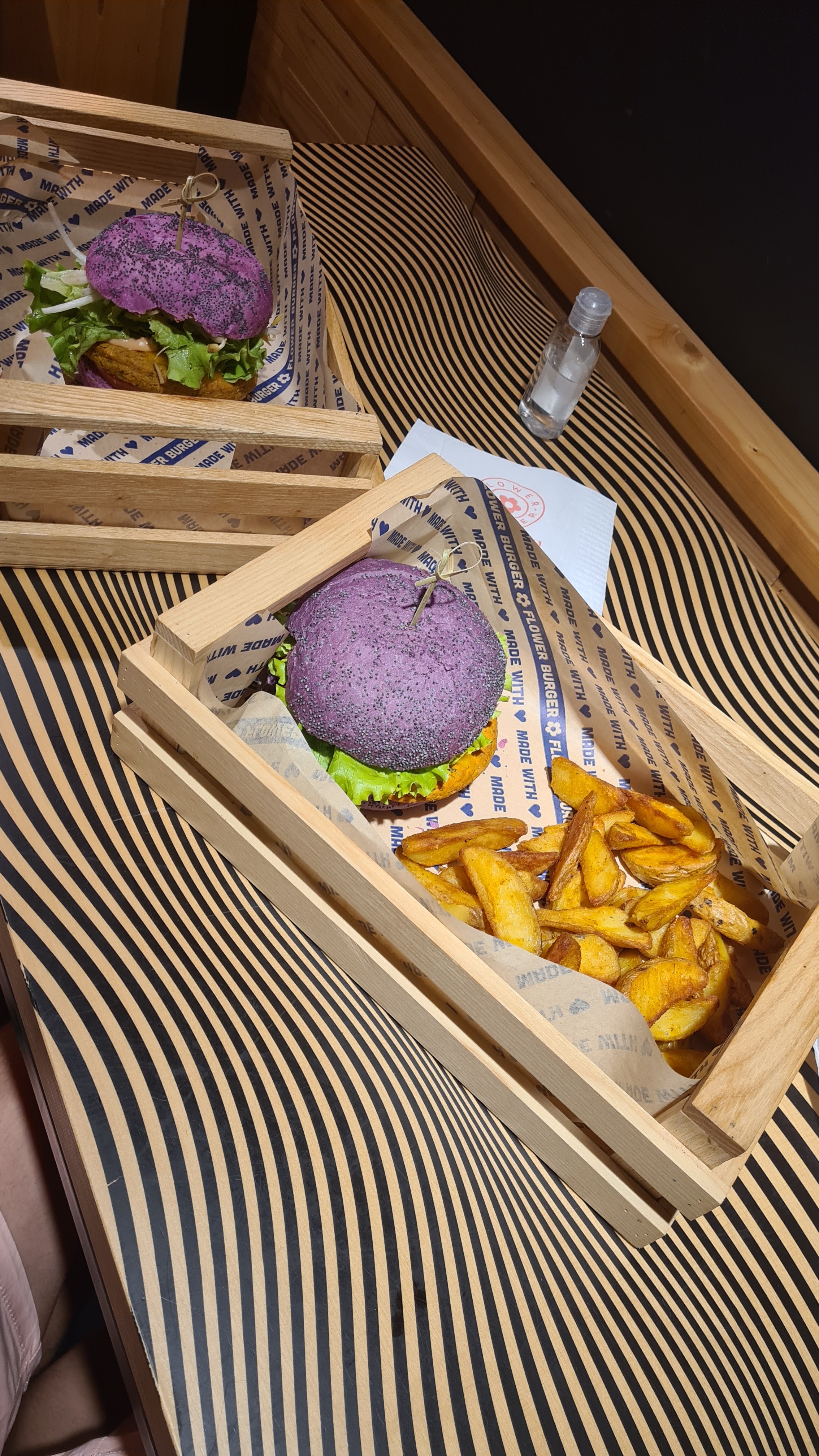 Une très belle surprise : un restaurant de burger 100% végétaliens! Les burgers sont très bons et très colorés! C'est pour moi la meilleure adresse végétalienne de Marseille. Nous avons pris le Cherry Bomb : bun rose, steak de lentilles, batavia, tomates confites, pousse de soja, flower cheddar - Butterfly burger : bun lilas, steak de brocoli, batavia, tomates, flower cheddar!! Je suis retournée manger au restaurant Flower Burger. Toujours aussi bon! Nous avons pris le SMOKY BUTTERFLY : bun rose (betterave), oignons croquants, salade, tomates, steak de champignons, flower cheddar, spirales de carottes, sauce smoky. Et le AVO TRUFFLE : bun vert (spiruline), mayo a la truffe, spirales de carottes, steak de champignons, guacamole, chou rouge mariné