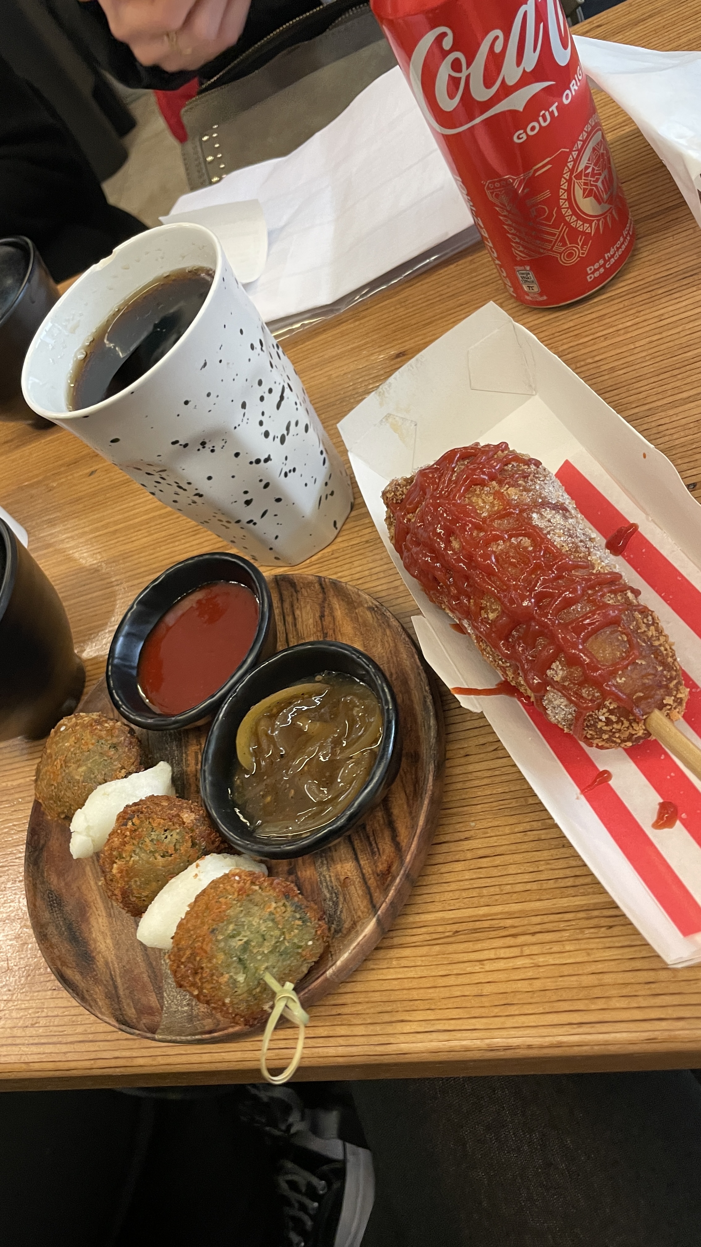 Un corn dog exceptionnel, croustillant à souhait, moelleux et gourmand. J'ai hâte d'y retourner et découvrir la carte 🖤 La cheffe s'est excusée du temps d'attente puisqu'il s'était cassé en cuisson elle a préféré en refaire un. C'est ce qu'on appelle avoir le sens du service.