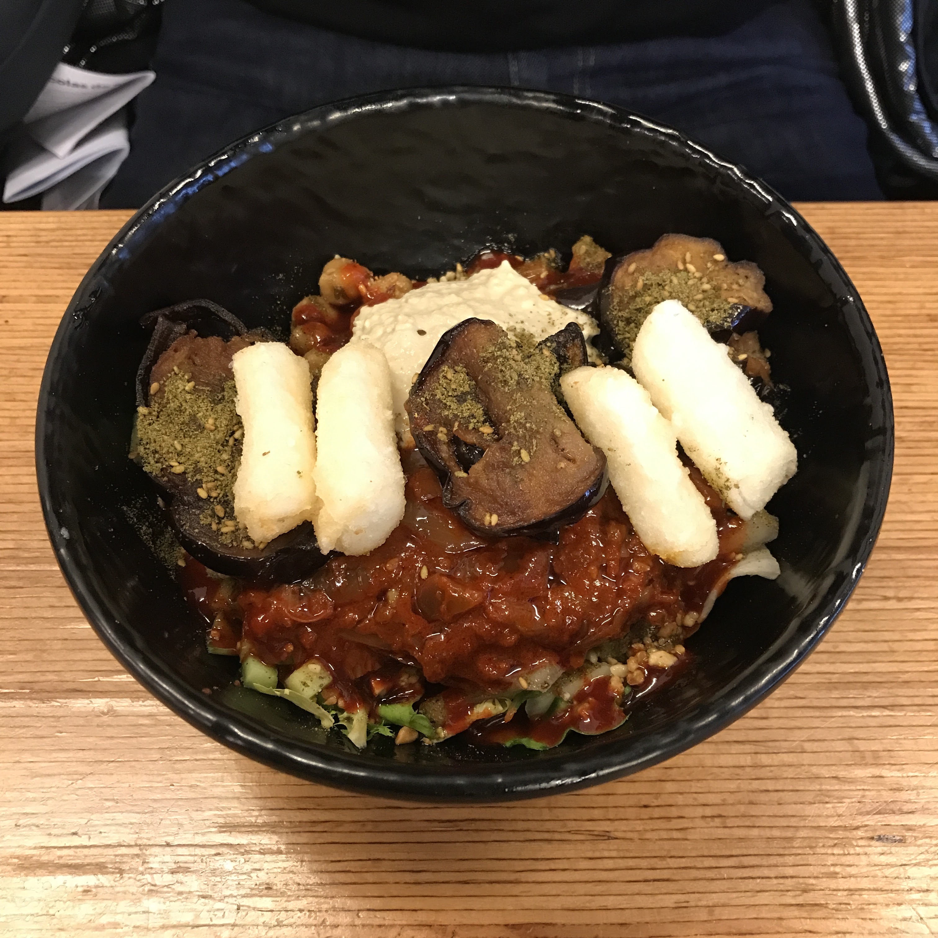 "Le lieu s'appelle pareil mais il a complètement changé de look avec des néons etc. et le menu proposé était aussi différent de ce que j'ai vu sur les photos précédentes. C'est un mix de cuisine libanaise et coréenne donc assiette avec falafel mais aussi kimchi etc. J'ai pris un burger végétarien avec : falafel, aubergine, salade, oignons, houmous et une sorte de sauce sucrée. C'était dé-li-cieux, ventre éclaté. La photo ne lui rend pas hommage, un délice !"
