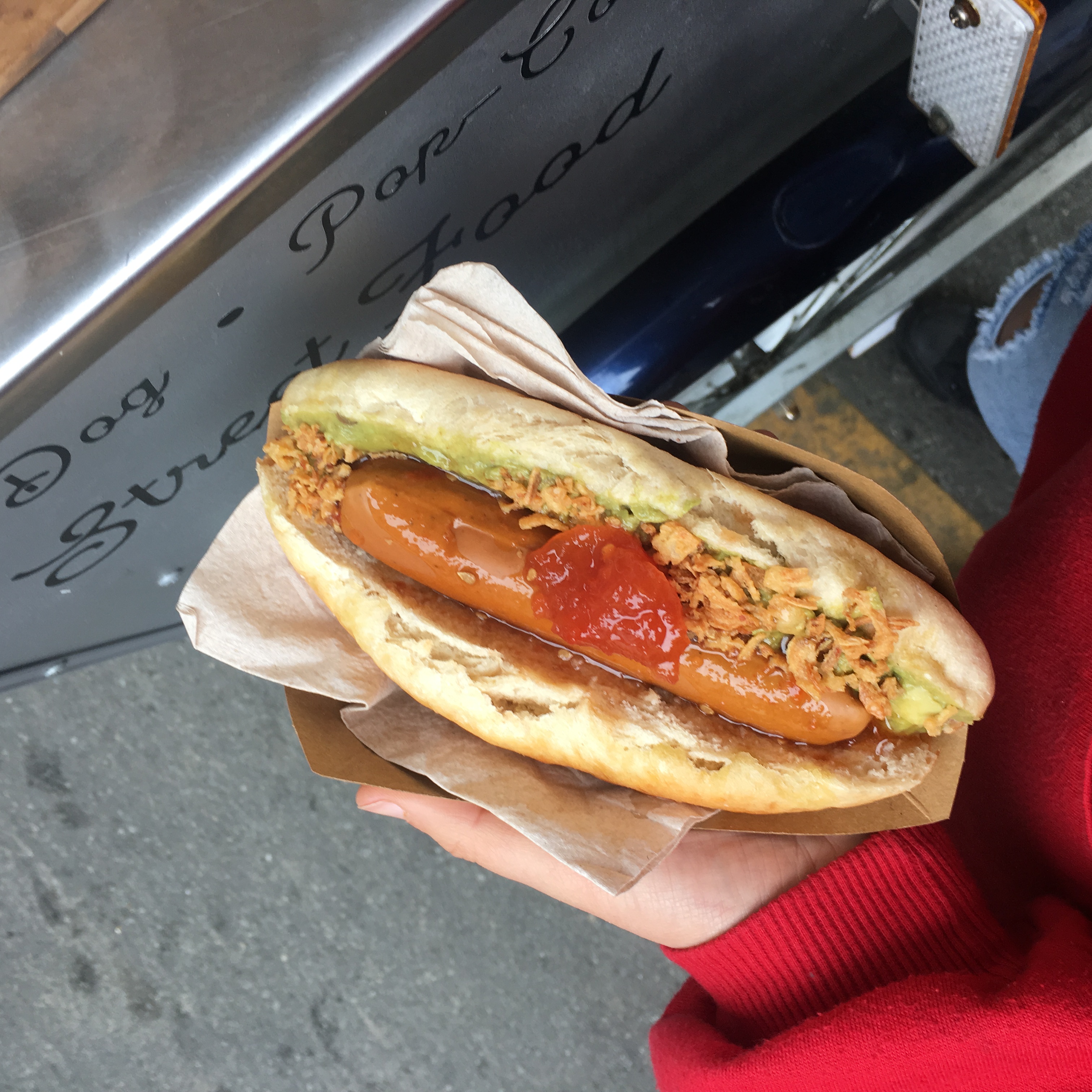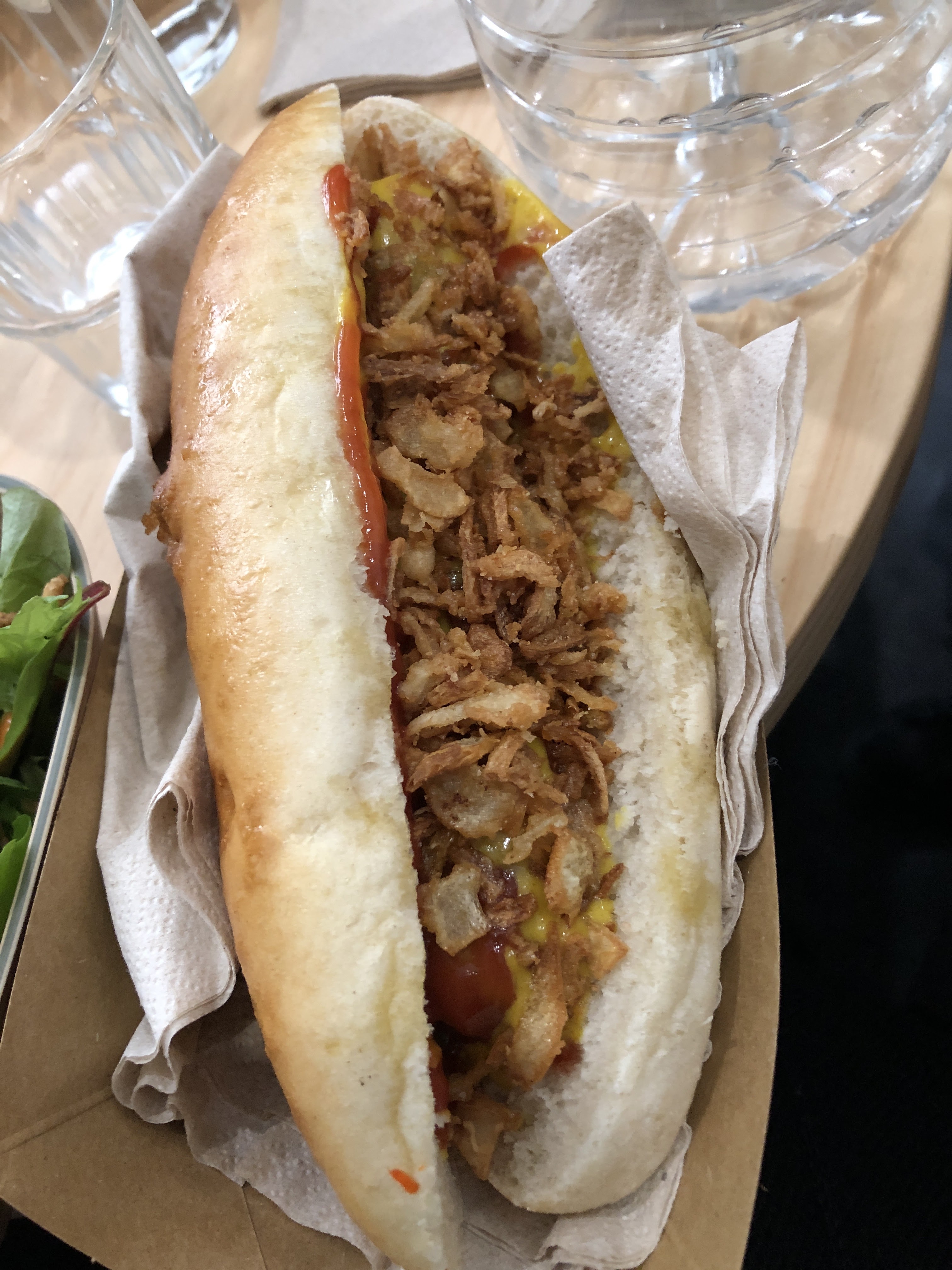 J'ai pris un hot dog avec les potatoes, je m'attendais à un simple hot dog pain saucisse mayo mais non. Il y avait des légumes dedans, une sauce et des petites fleurs qui donnaient un goût exquis! Les potatoes etaient elles aussi très bonnes. Je recommande !