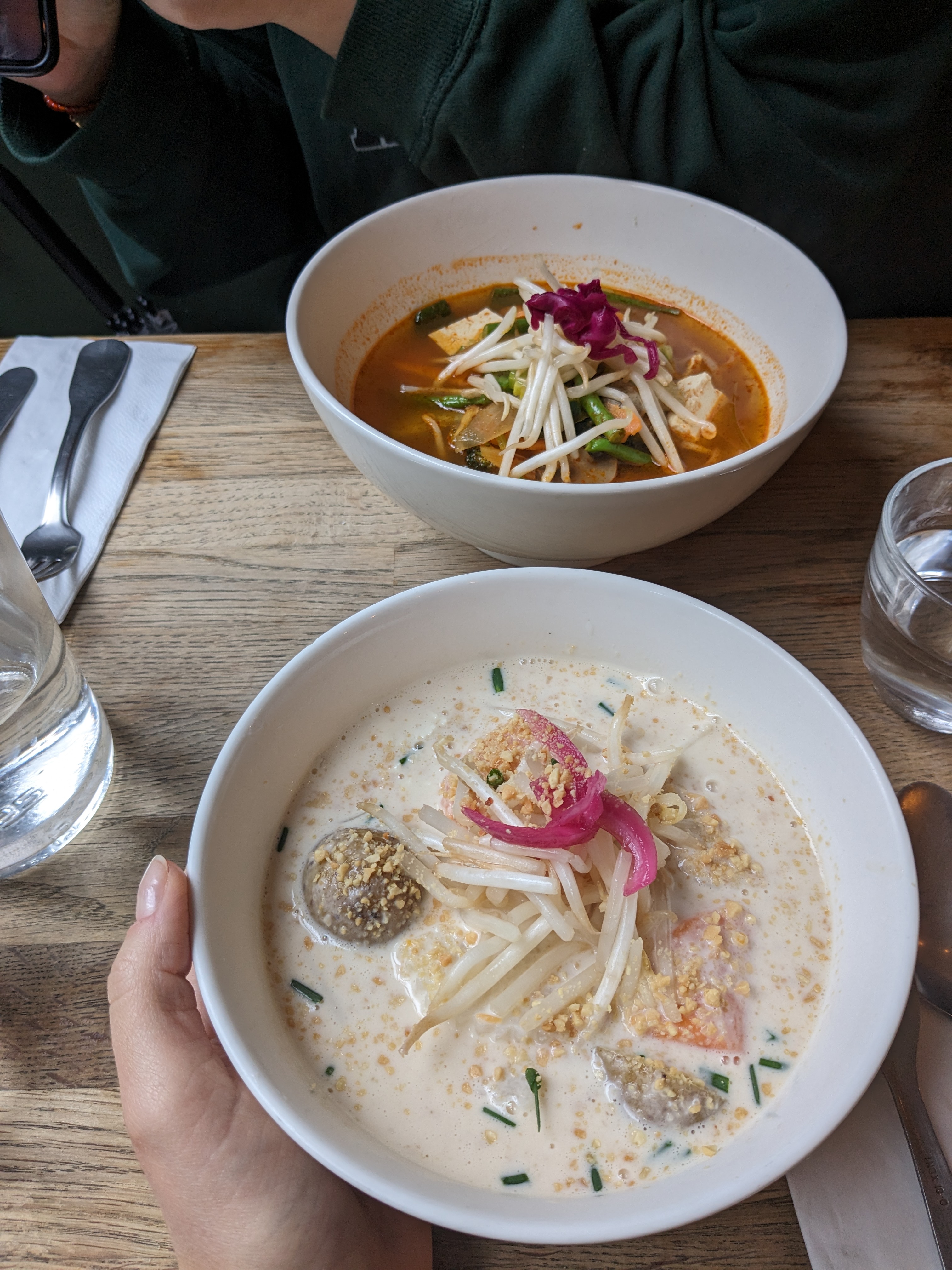 Très bon, serveur parfait, super ambiance. La Tom Kha était délicieuse et la citronnade au basilic et au gingembre très bonne et originale. Curry panang un petit peu salé. Pourriez-vous svp couper les brocoli plus petits ou non donner des couteaux ?