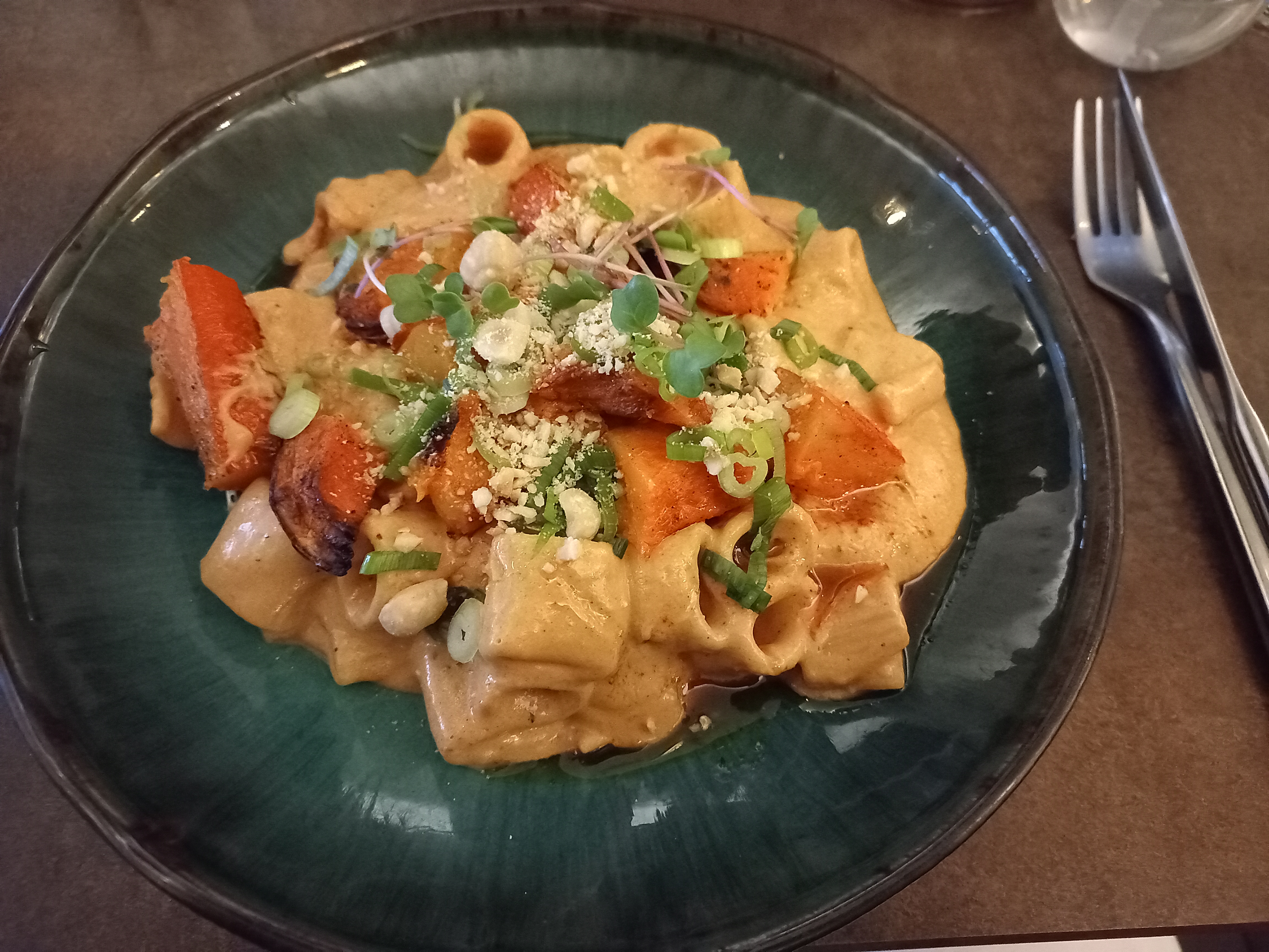 Cuisine originale et dans l’ensemble très bonne mais nous avons quand même manqué de fromage dans les recettes. Nous avons choisi un restaurant végétarien, pas vegan ou alors nous avons manqué quelque chose… Un autre point, il faut réparer cette sono:, entre chaque morceau de musique il y a une fréquence dans les bas médium qui rend complètement fou.