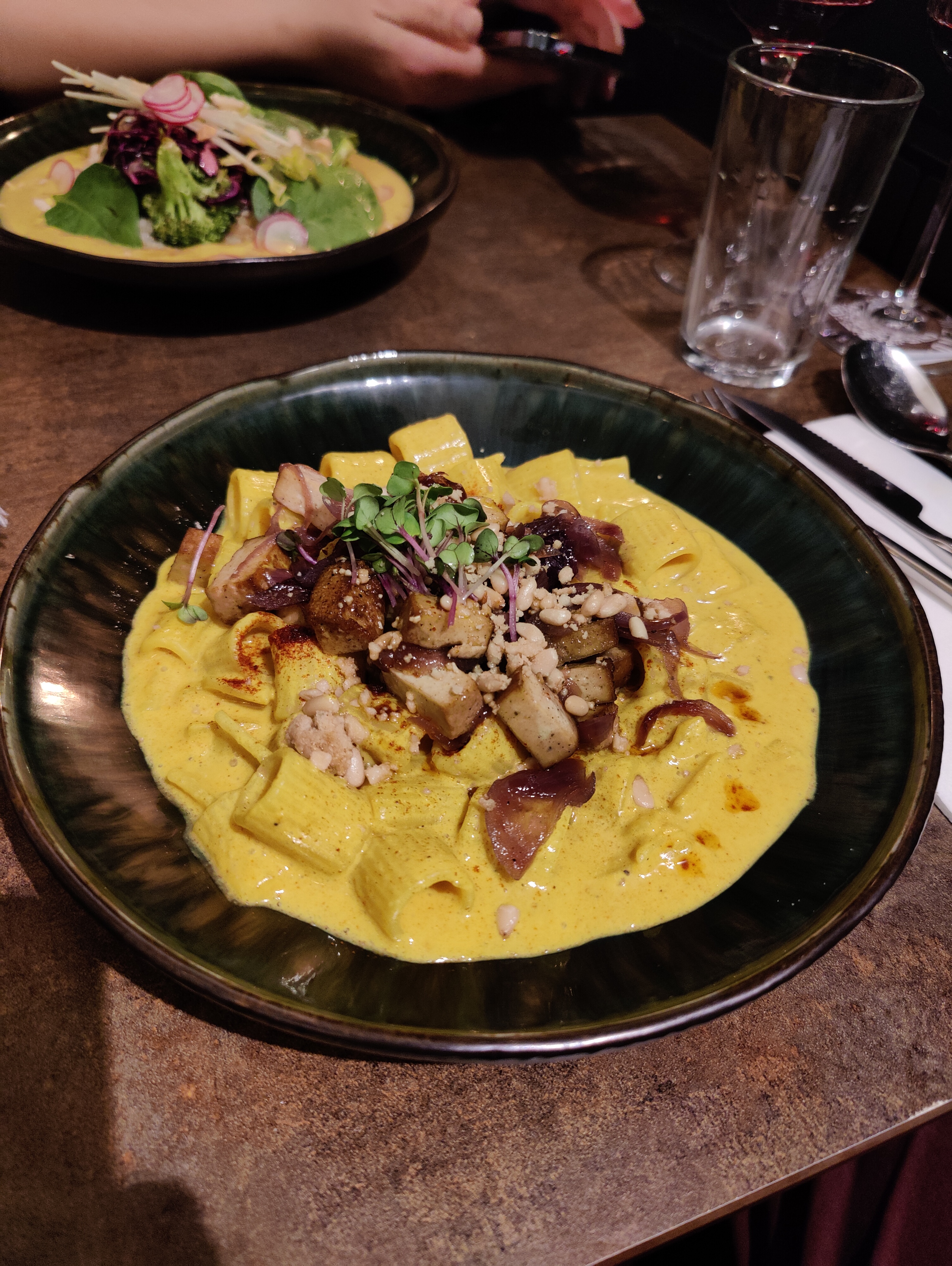 Un dîner la tête dans la nuage 💛 J'ai eu la chance de découvrir ce restaurant hier soir avec une amie et nous avons toutes les deux été séduites par la finesse des mets proposés et par le charme de l'ambiance que les frères Valentin ont su créer. En entrée, nous avons opté pour le tofu mariné au piment d'Espelette et la patate douce rôtie à la crème de sésame au sirop d'érable. En plat, nous avons toutes les deux choisi les rigatoni façon carbonara 🍝 Et en dessert nous nous sommes laissé convaincre par les crêpes à la crème de cacao et noisettes et par la mousse au chocolat. Il n'y à rien dire si ce n'est que c'est savoureux, fin et généreux. Et, croyez-moi, c'est plus la gourmandise que la faim qui vous poussera à finir par une troisième assiette! Sans aucun regret toutefois ! Un immense bravo au chef David et à ses équipes ❤️ et au plaisir d'y retourner.
