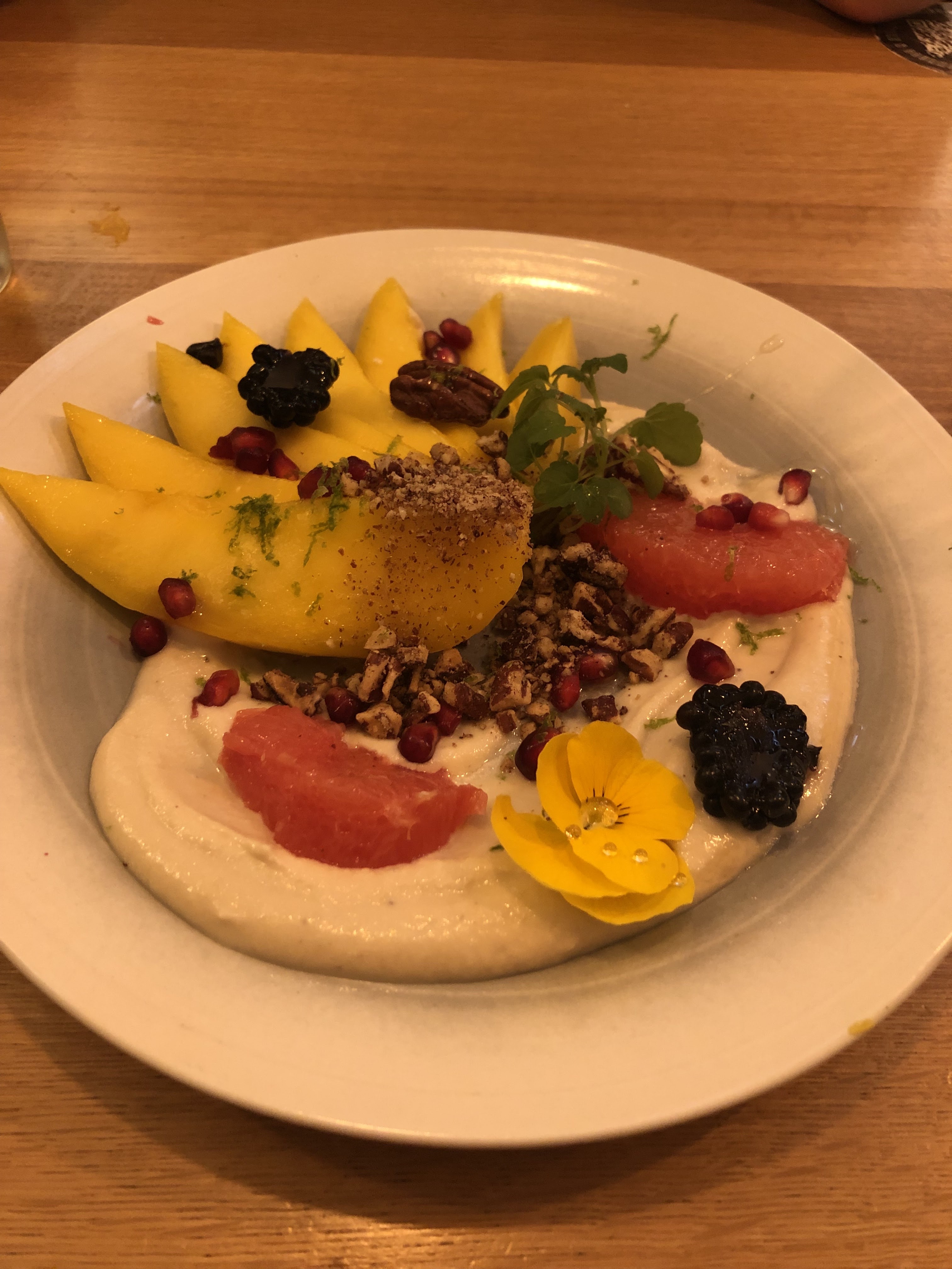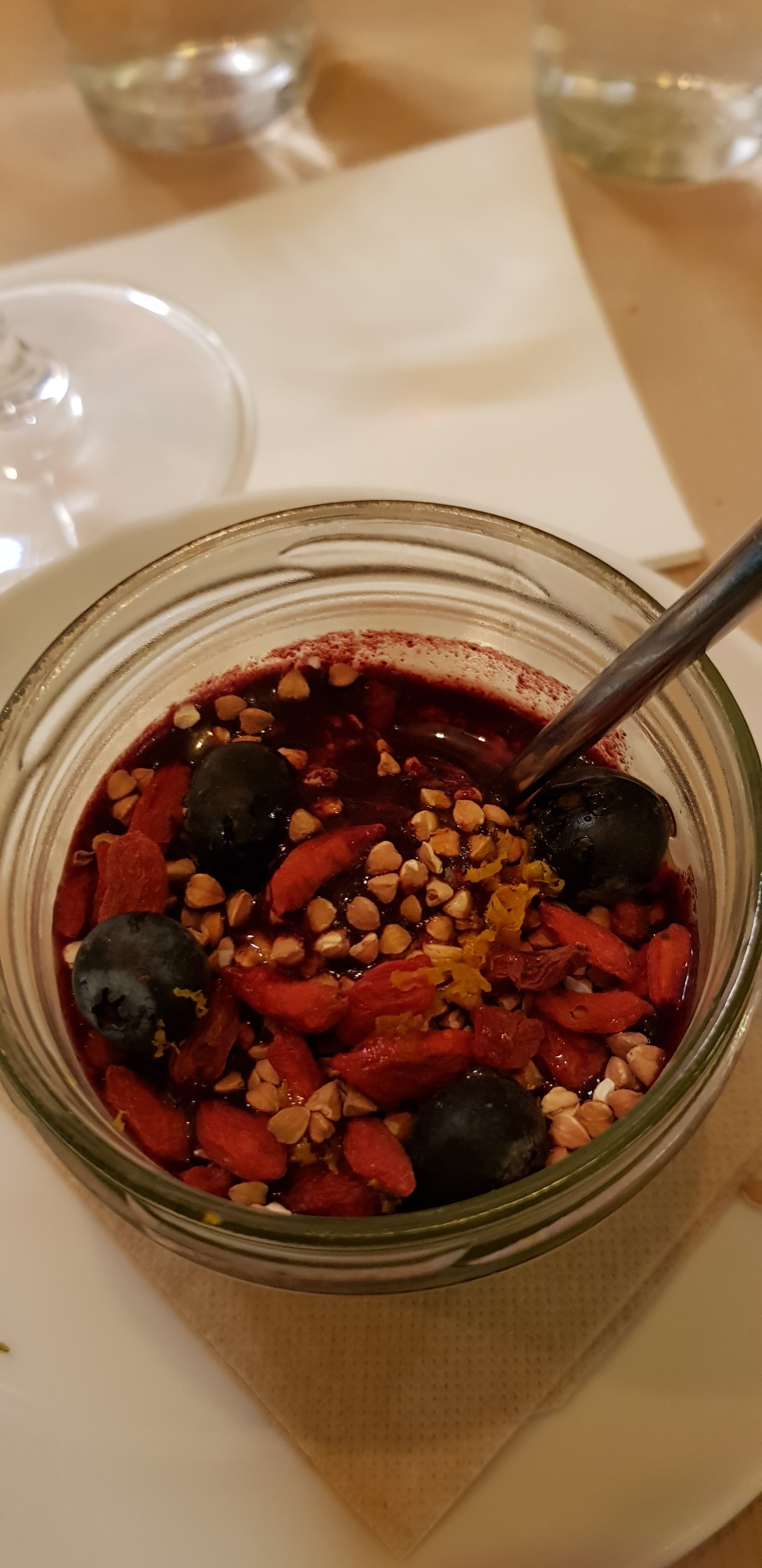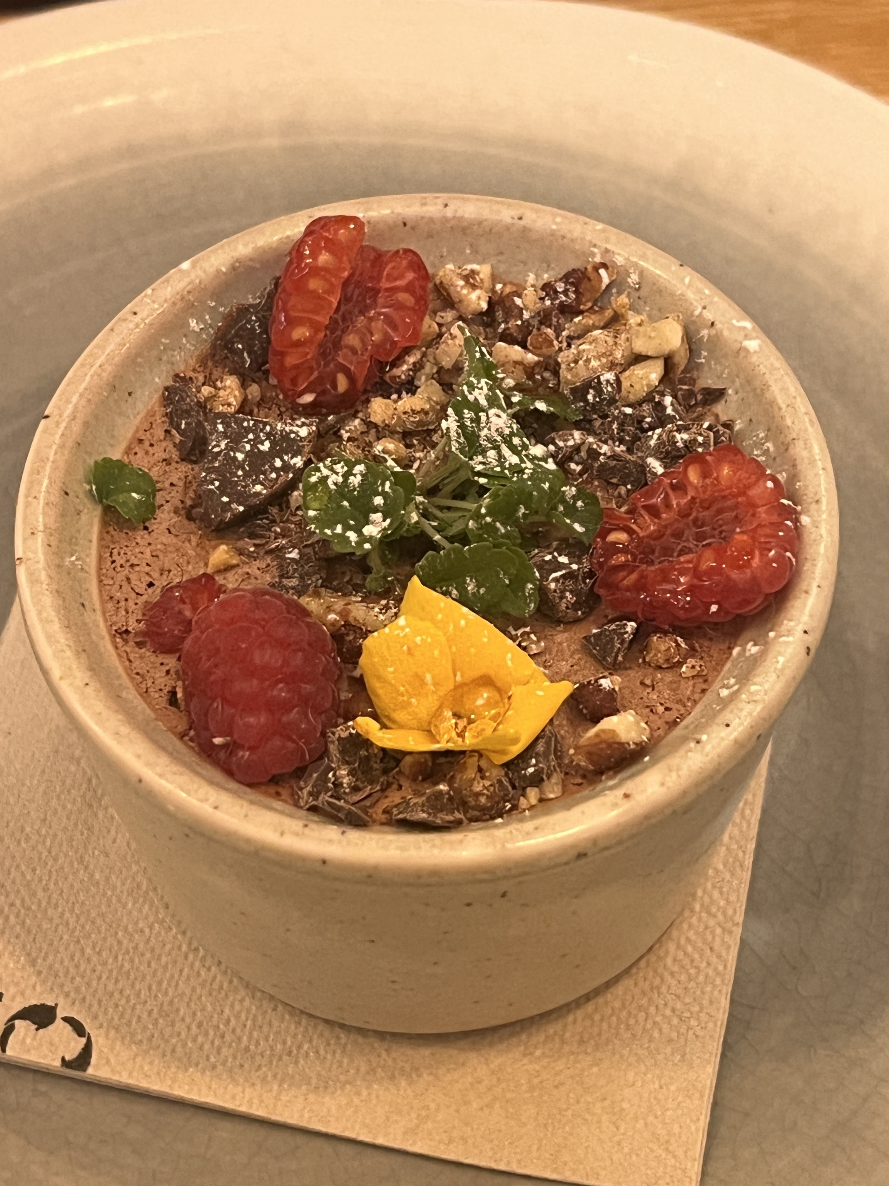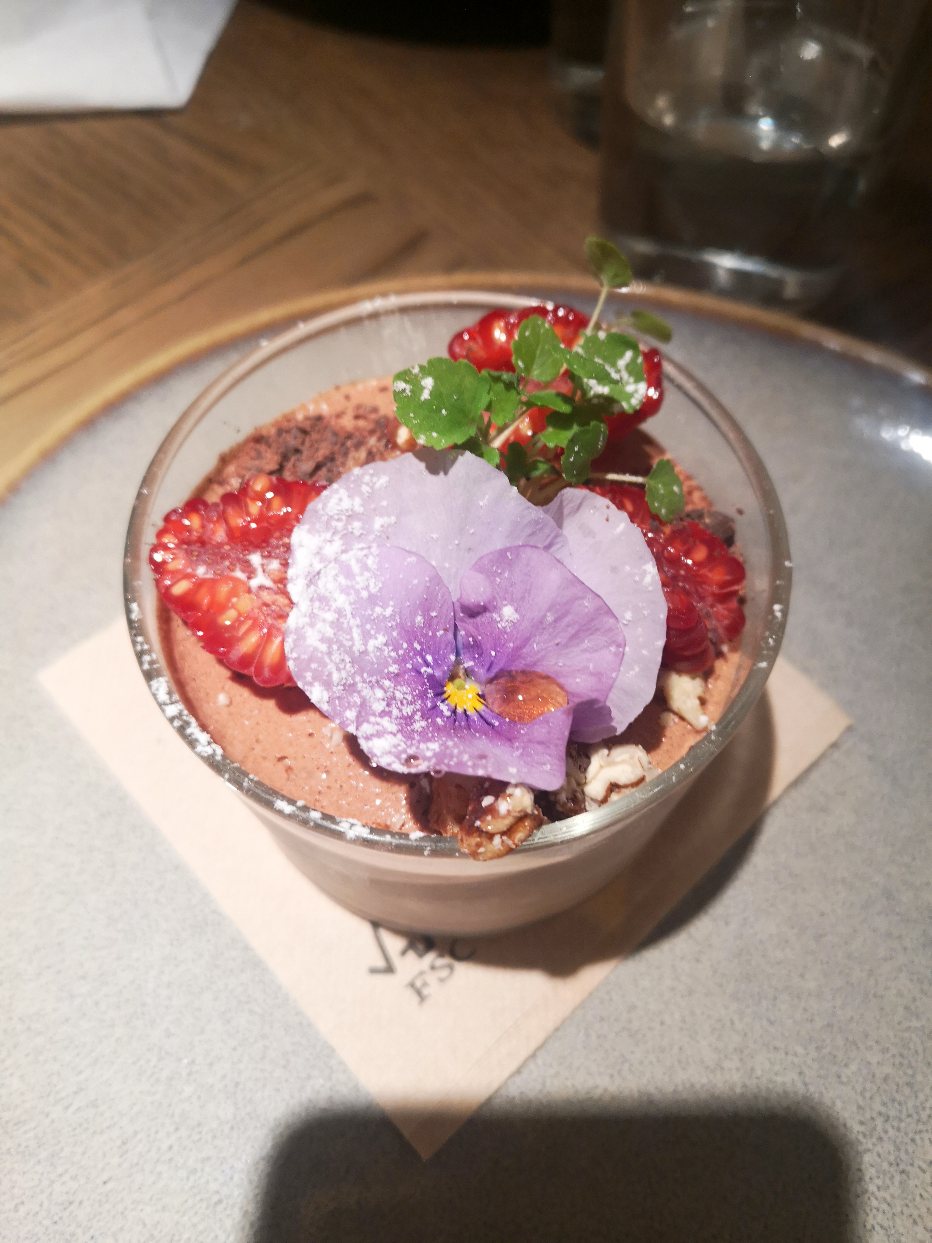 L'entrée (pavé de tofu) était très bonne. En revanche le plat (millet chou fleur) n'était qu'une sorte de purée, plat très monotone pour 20€. Mousse au chocolat excellente. Globalement mon ressenti en sortant de ce restaurant : je l'ai trouvé cher (47€ entrée plat dessert boisson ) pour un plat très moyen que je n'ai pas terminé.