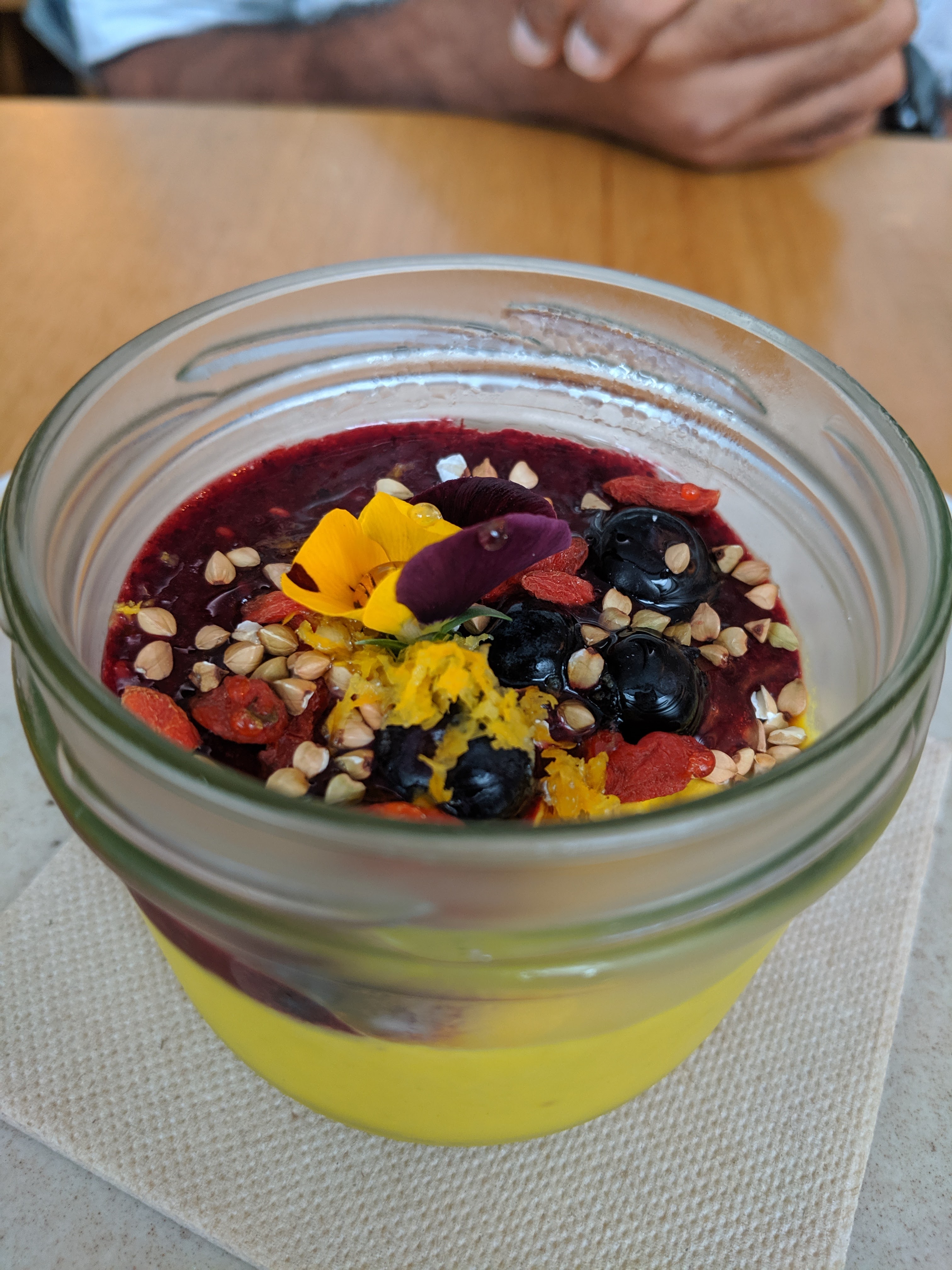 Posté le 29/05/2018 à 00:23"L'entrée était bonne avec un bon goût épicé de curcuma. Par contre, la sauce tomate du plat était fade, le restaurateur a indiqué utiliser moins de sel mais pour le prix du plat avec la quantité dans l'assiette, un peu mieux dosé en épices, la note aurait été moins salée.. pour 1 entrée, 2 plats, un jus de saison et 1 expresso 55,30€ c'est trop élevé Nouvelle expérience aujourd'hui avec le brunch... nous avons attendu + de 30 min pour avoir les boissons, encore plus pour le plat. C'est bon mais vraiment trop cher par rapport à la quantité qu'il y a à manger. Le plat consiste en deux entrées réunies dans une assiette et le dessert en une verrine de yaourt et deux pancakes... On reste un peu sur notre faim (35€! Avec une boisson chaude et une froide)"