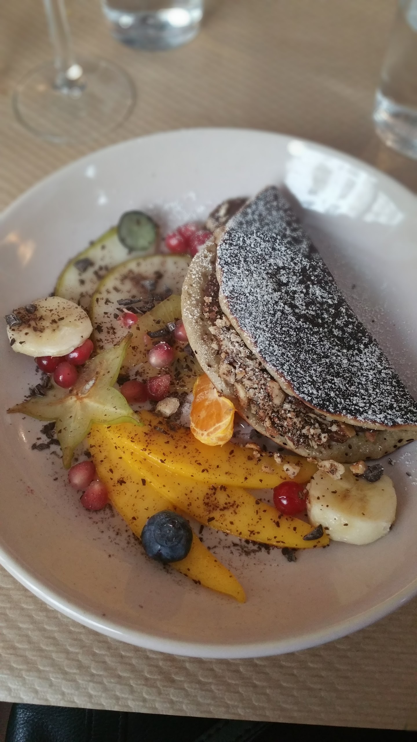 Un regal - le brunch est délicieux avocat sauce houmous au curcuma, crêpes riz et pois chiche à la crème de cajou, pancakes riz et amandes en dessert + fraises à la crème de cajou vanille - le chai aussi est très bon - on y retournera !