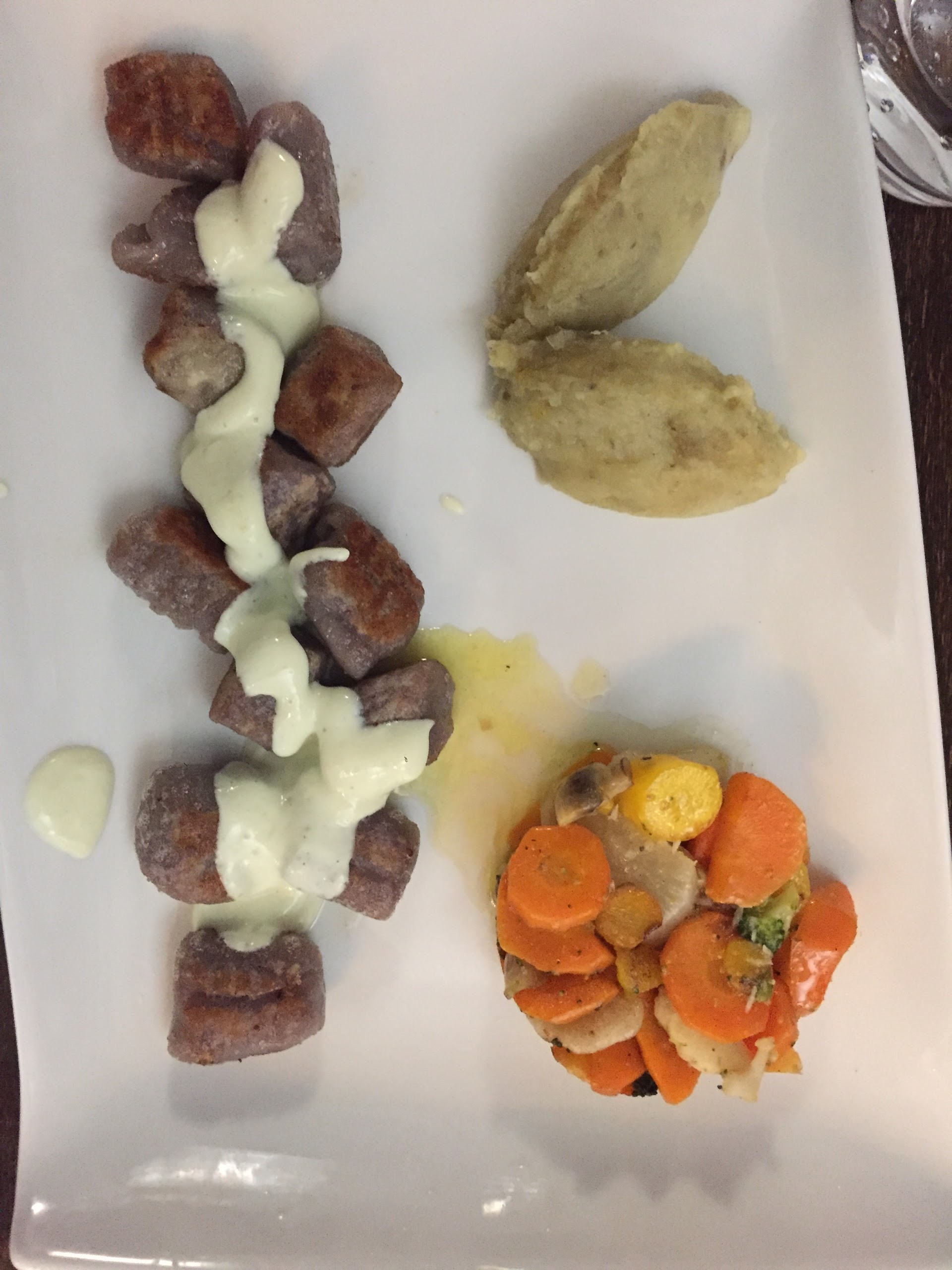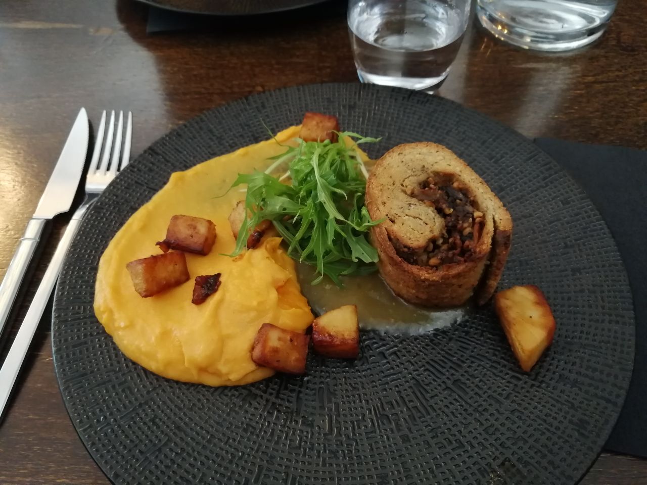 Vraiment très bon et savoureux ! Rien à redire. Des saveurs qu’on ne trouve pas ailleurs en restauration vegan. Sur les photos : hachis parmentier et pana cotta.