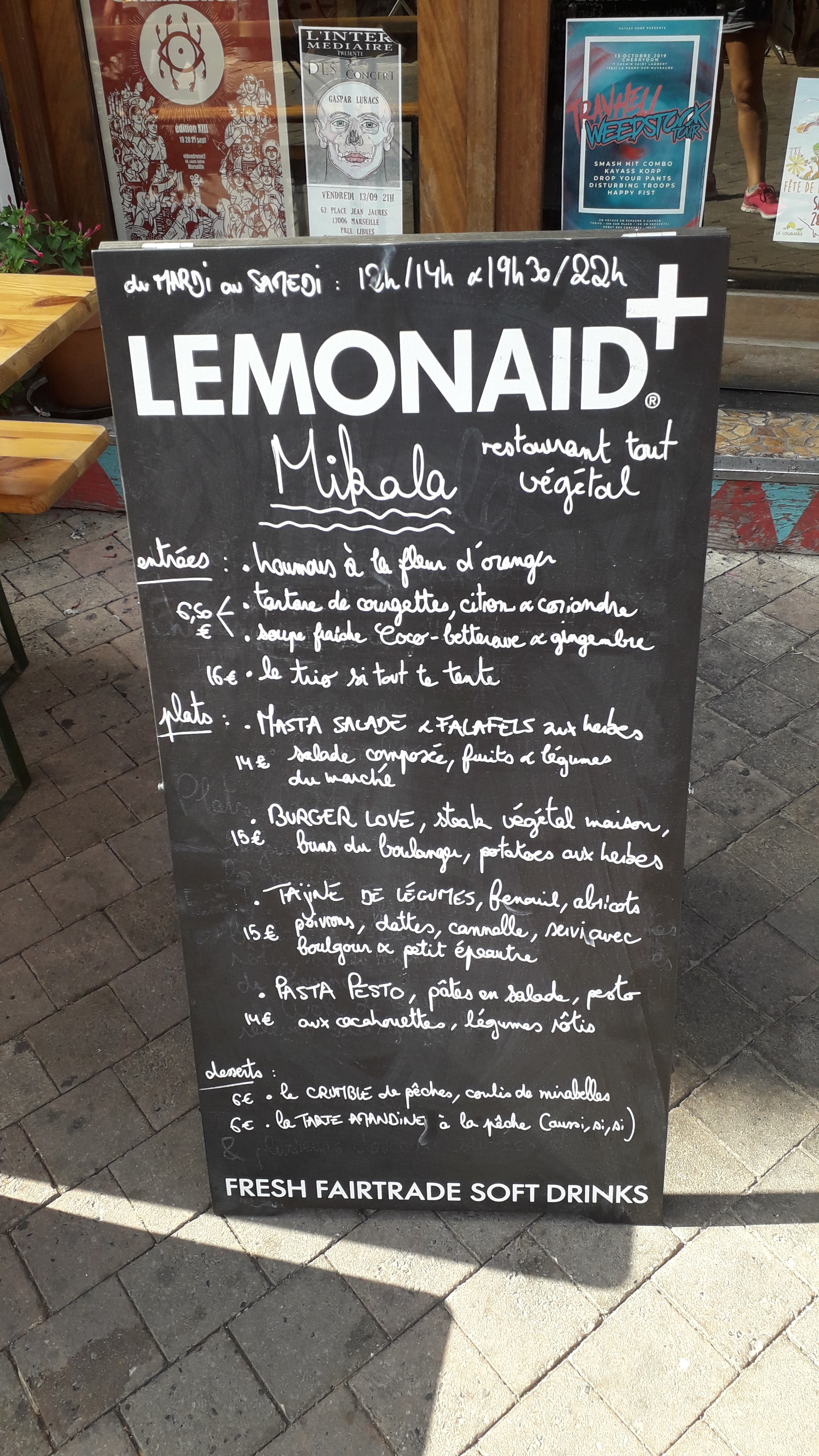 Il y'a 3 ans quand c'était Mikala et encore avant, du temps du cours en vert c'était délicieux et copieux. A ce jour quel dommage d'avoir des assiettes si peu garnies, et où est passé le délicieux burger végétal.... 11€, une part de tarte à la tomate sans rien d'autre dans l'assiette quelle déception. Sinon accueil très sympathique et le mérite d'être un des rares restos végétal, sinon le seul à être ouvert le soir sur Marseille. Peut-être sommes-nous tombés sur un mauvais jour