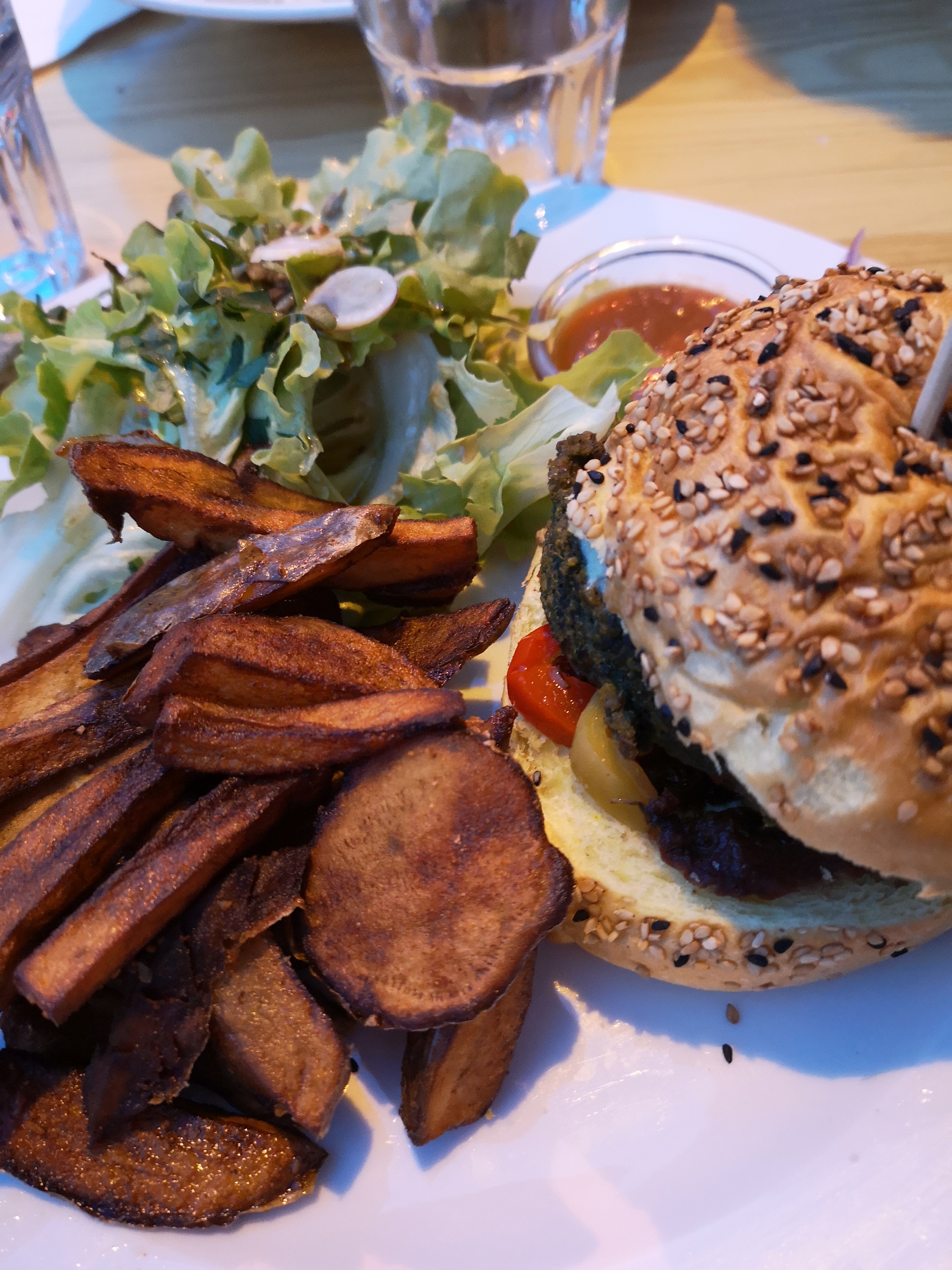 Je n’ai jamais été fan de la cuisine veggie vegan mais il faut bien reconnaître que ce restau a balayé tous mes aprioris sur le sujet 😉 Le burger est terriblement bon 😋 les frites de patates douces, une tuerie et encore plus avec cette sauce sucrée parfaitement goûtu... l’ambiance champêtre passe très bien sur cette grande place aux accents cosmopolites. Un régal pour les papilles et pour le porte monnaie qui vous permettra de profiter pleinement du glacier Ego, juste en face 😁