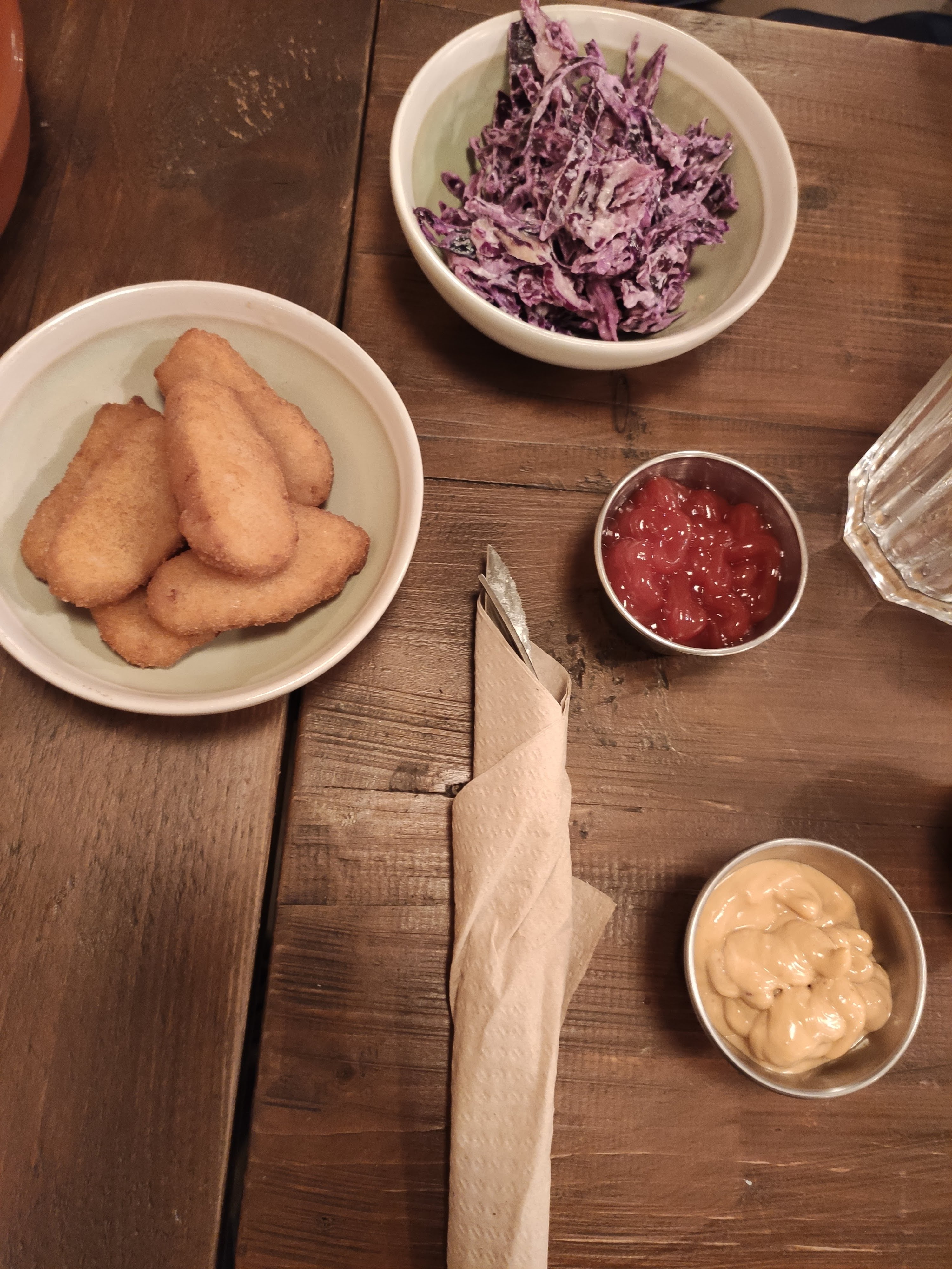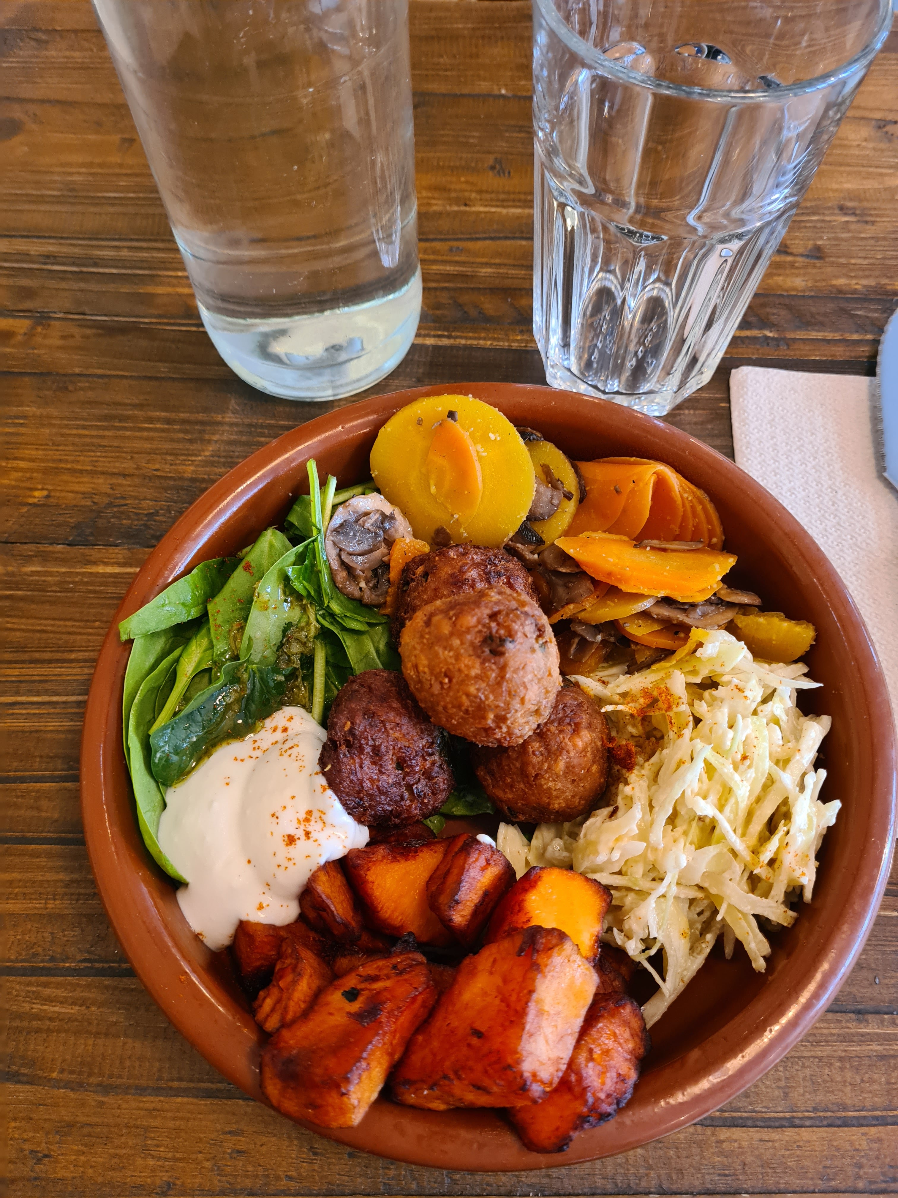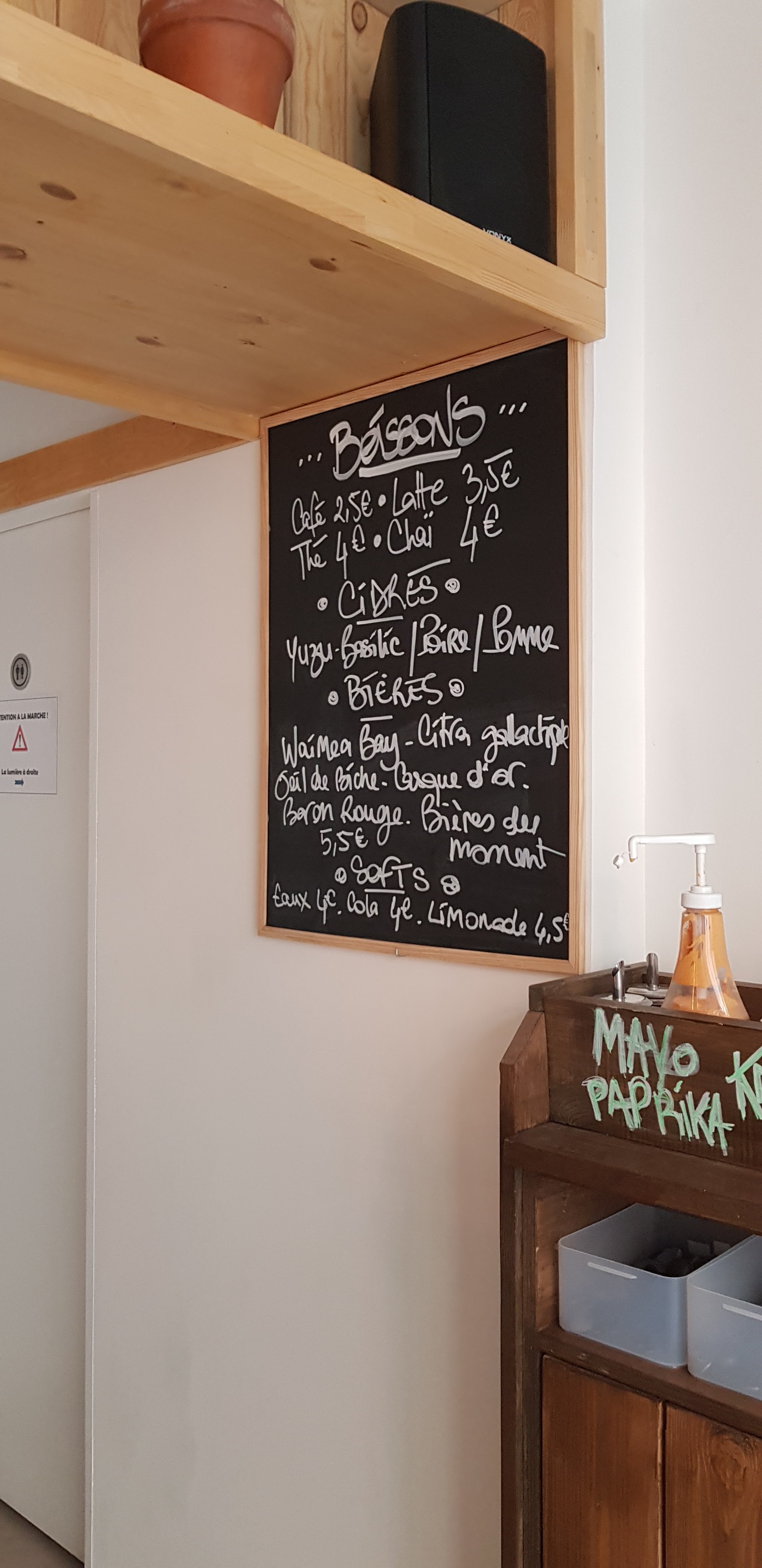 J'ai été très bien accueilli, j'étais là seule cliente Toutefois j'ai été déçu par mon choix de plat. J'ai pris un croc et je pensais pouvoir en faire un repas mais il est beaucoup trop petit pour ( j'ai pas été bien conseillée) Ayant encore faim j'ai pris du coleslaw mais il y avait beaucoup trop de veganaise Le cookie en dessert était bon mais fait de la veille