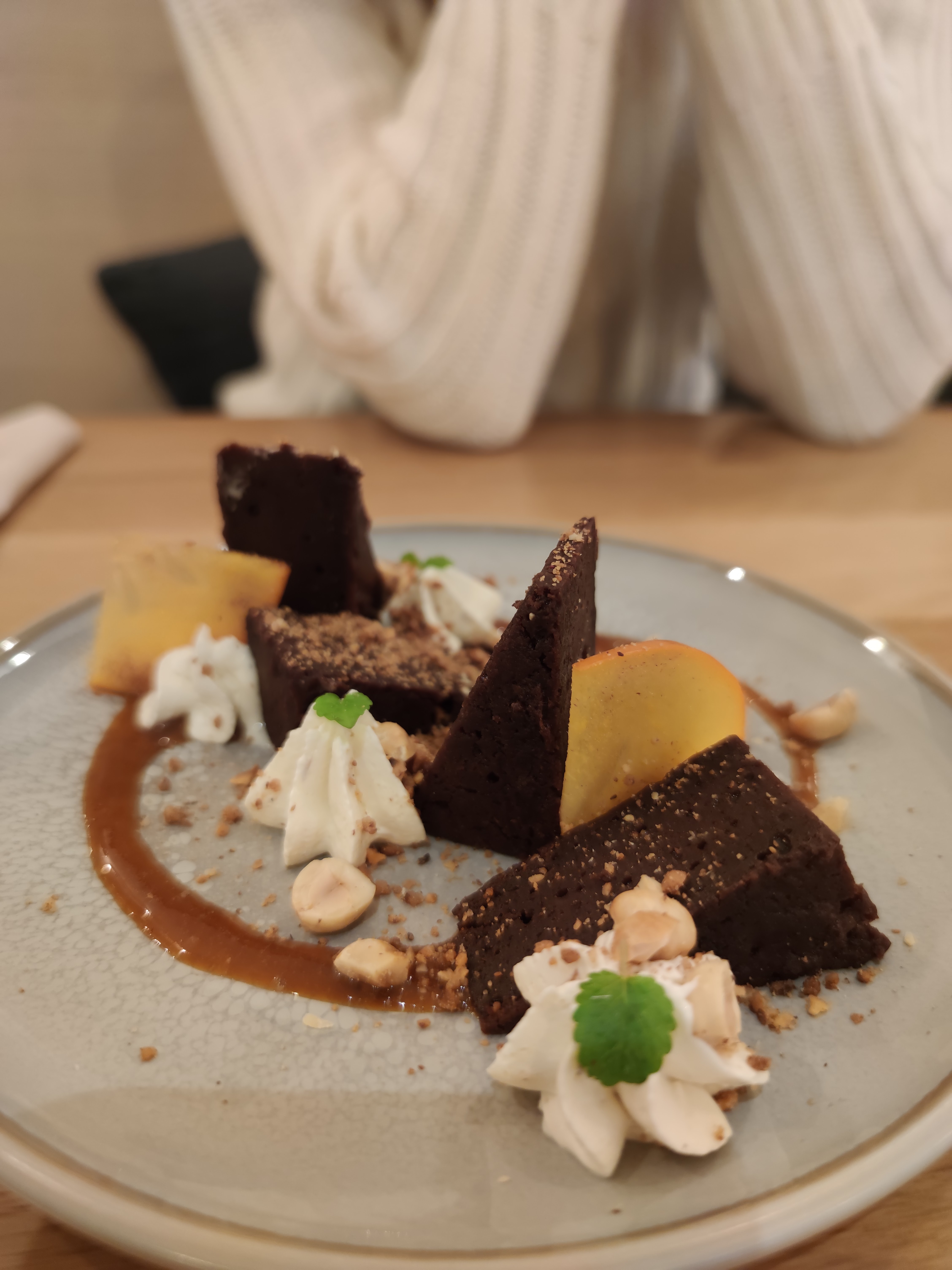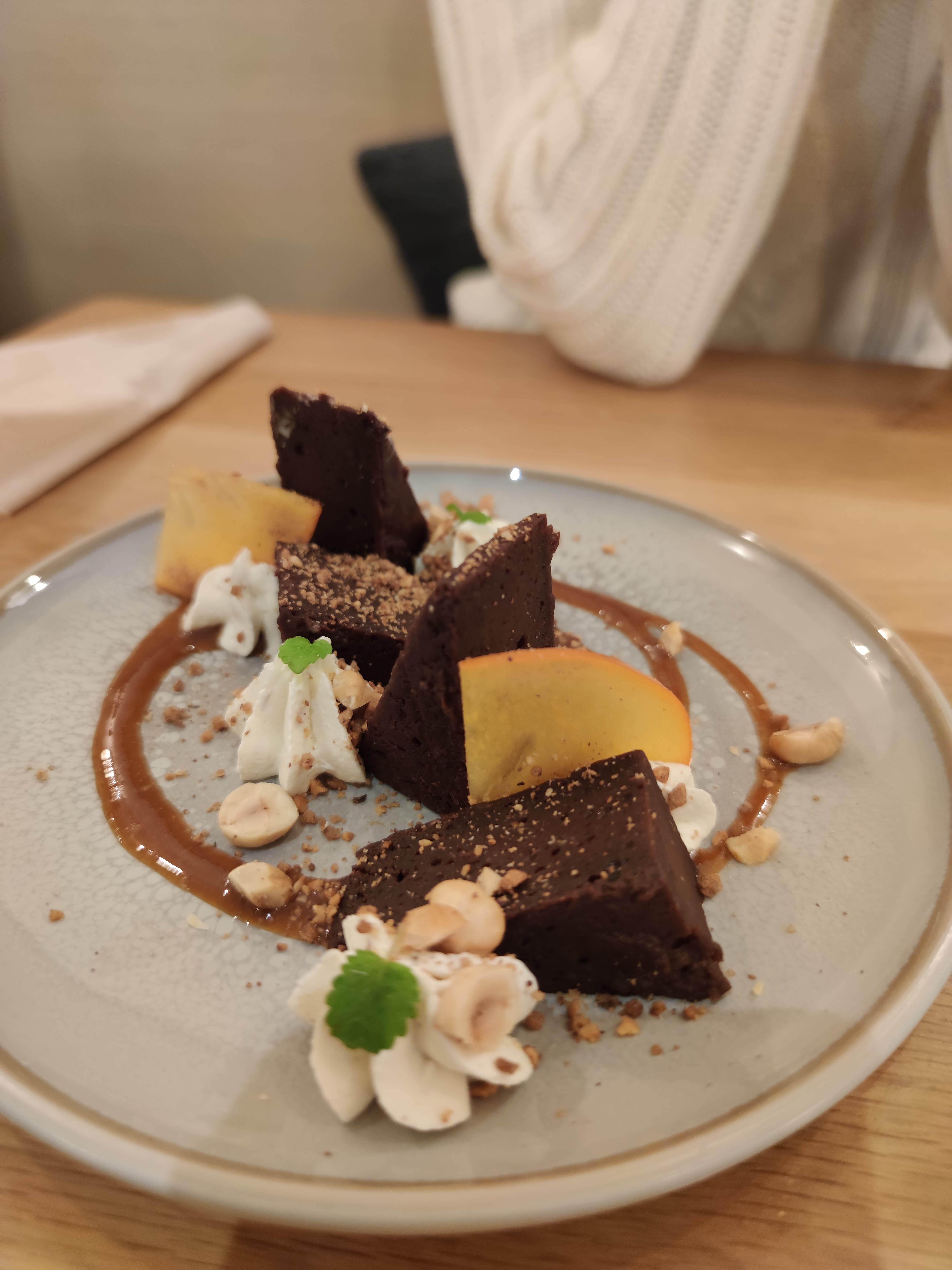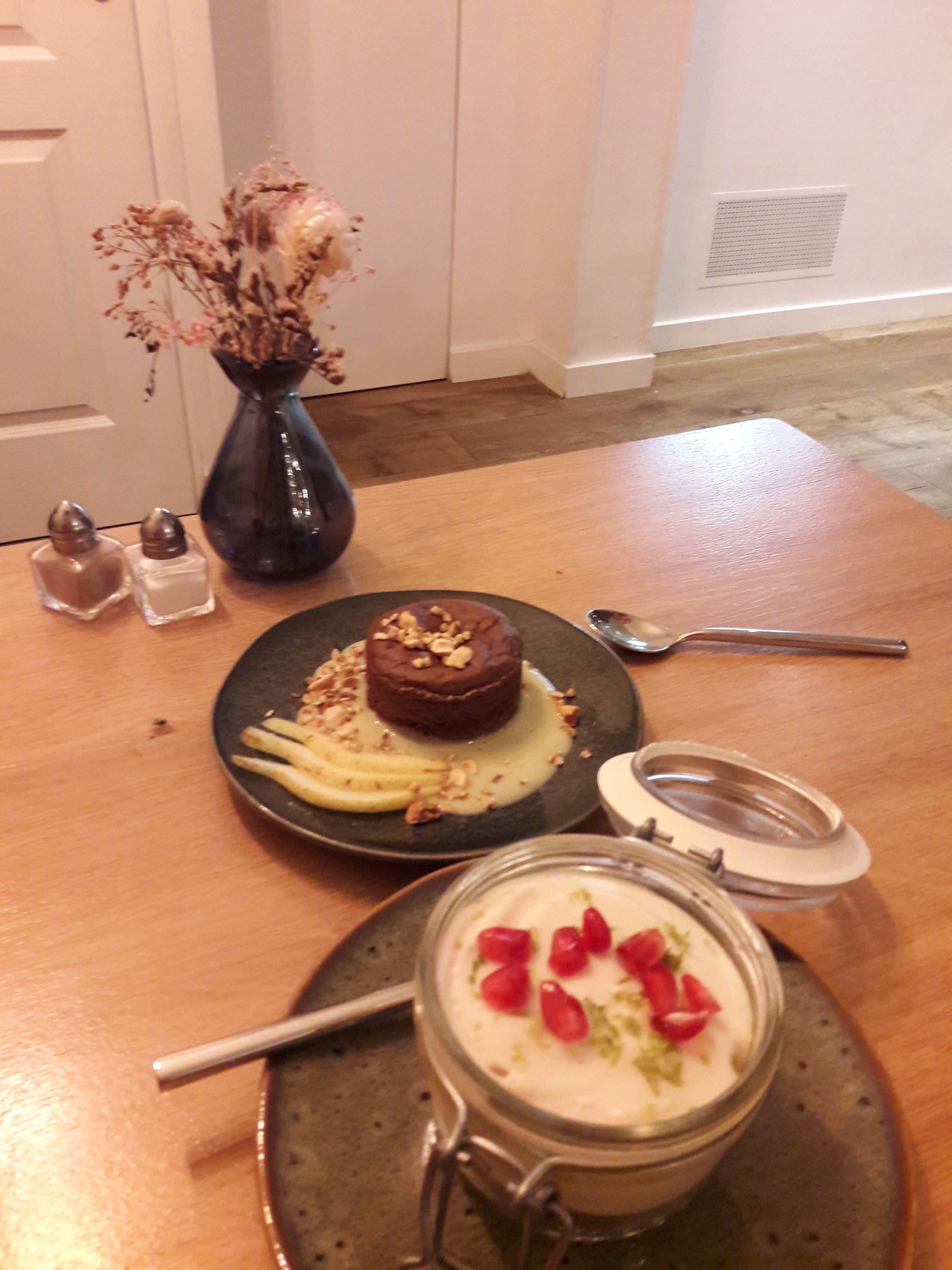 J’ai beaucoup aimé le soin apporté aux plats, à la vaisselle ainsi que l’accueil. Mes plats étaient très bons (en photo), à noter qu’ils sont très relevés (pour moi en tout cas). J’ai néanmoins été un peu déçue (d’où l’étoile en moins) par le rapport qualité/prix : nous en avons eu pour 34 € par personne (entrée plat dessert) ce qui me semble un peu élevé par rapport à un plat principal avec 60-70 % de patate douce et de tofu acheté tout prêt (EDIT : dans le sens que le tofu n’a pas été fabriqué sur place). Idem pour le risotto à base de quinoa. :)