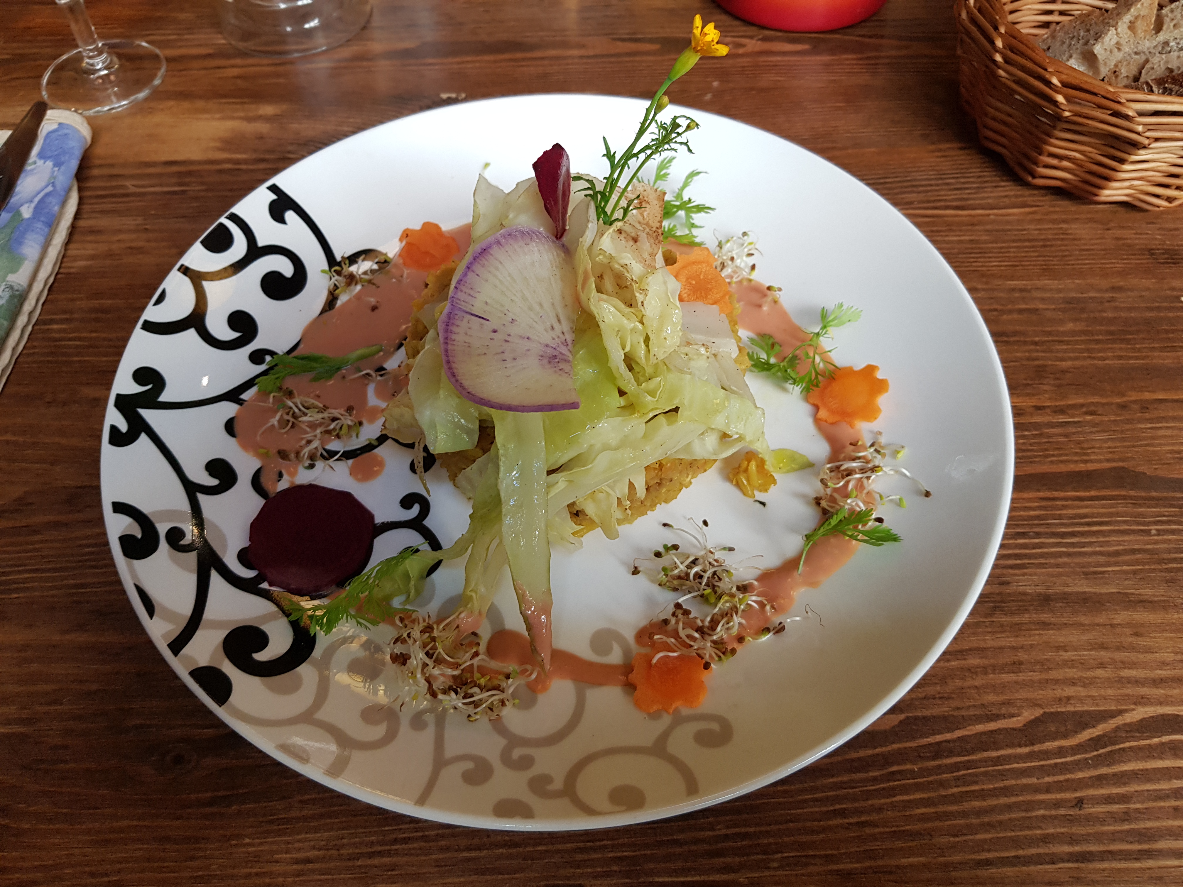 Le lieu est très joli. En revanche pour la cuisine même si cela est bio et 100% vegan cel ne suffit pas. Nous avons commandé un velouté de courge et lait de coco, nous avons reçu une soupe avec de gros morceaux (environ 2cm !) d’écorce d’orange et autres graines, absolument dans la description de l’entrée. Le menue s’est poursuivi avec une sorte de pad thaï avec des pâtes craie trop cuites et des haricots pas vraiment réhydratés et encore des écorces d’orange, toujours pas indiqué dans la description du plat... et on termine at une poire rôtie qui croustille sous la dent... cuisine très clairement à revoir. Je ne conseille pas du tout.
