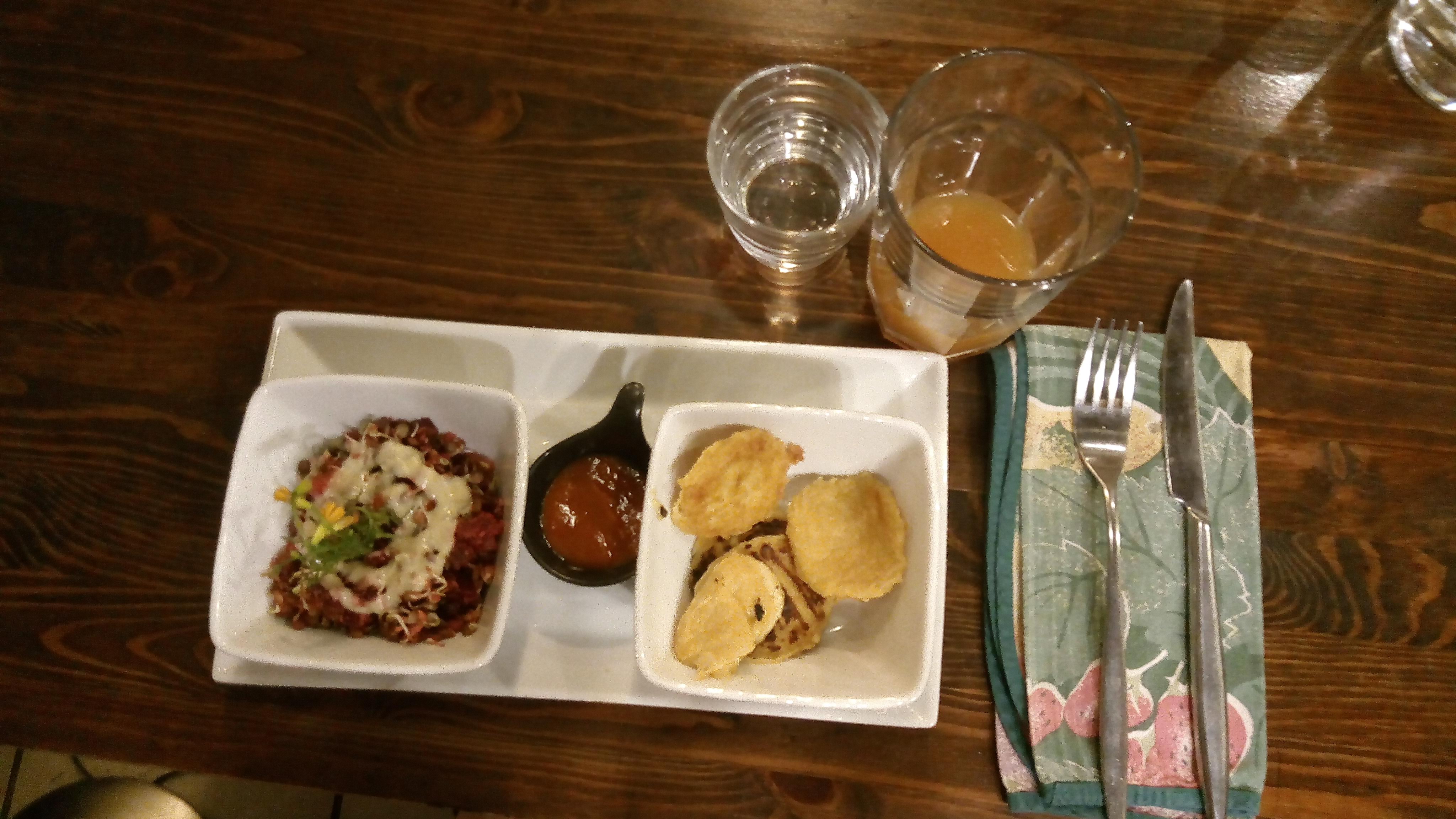 Restaurant vegan ne détaillant pas le contenu de ses plats donc attention aux allergies alimentaires. Non recommandée aux femmes enceintes (graines germees et huiles essentielles dans les plats). J'avais encore faim en sortant malgré un menu entree+plat pour un prix assez élevé au vue des quantités.