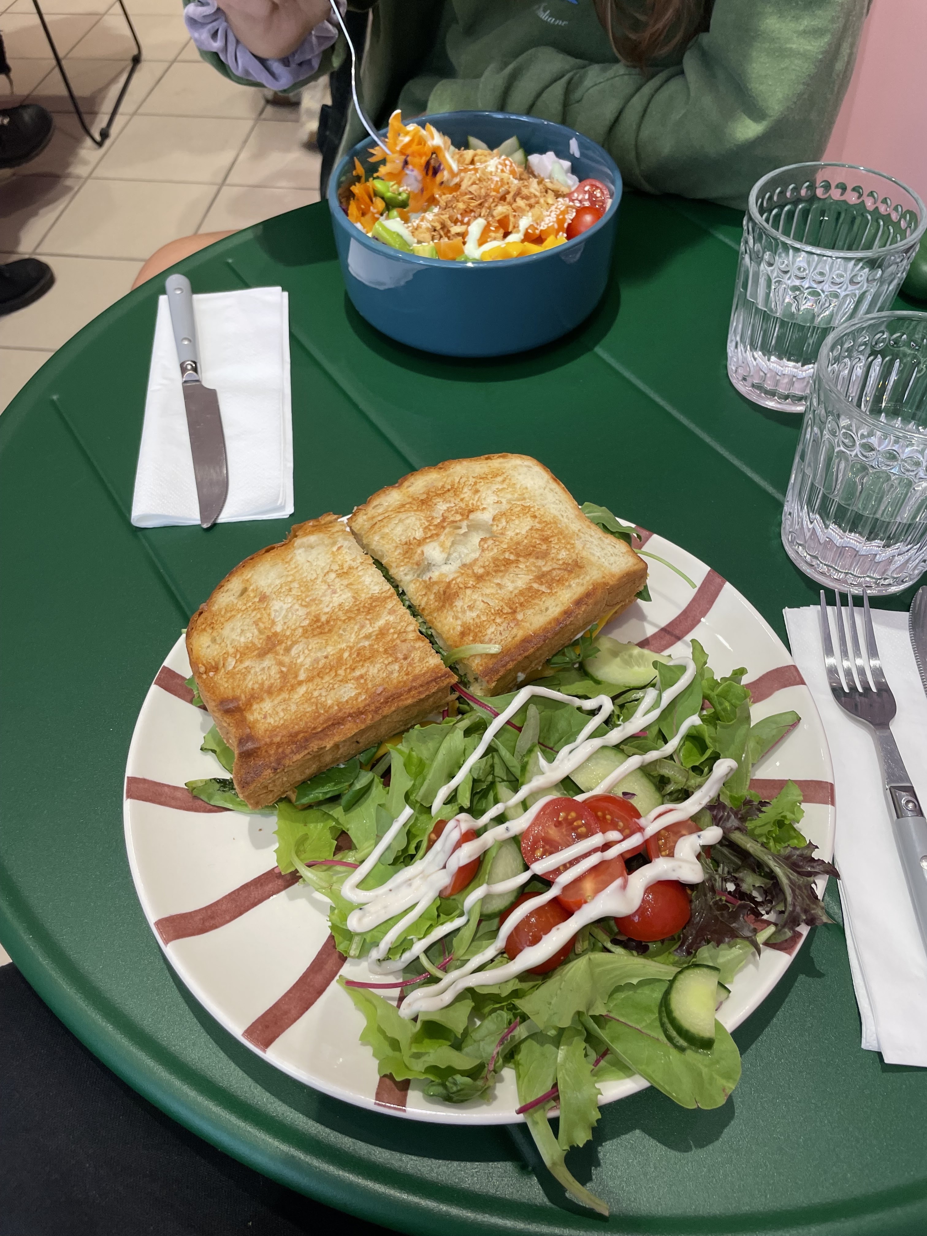 Nourriture merveilleuse. Le sandwich et la salade représentent beaucoup de nourriture. Excellent service et ambiance. Merci.