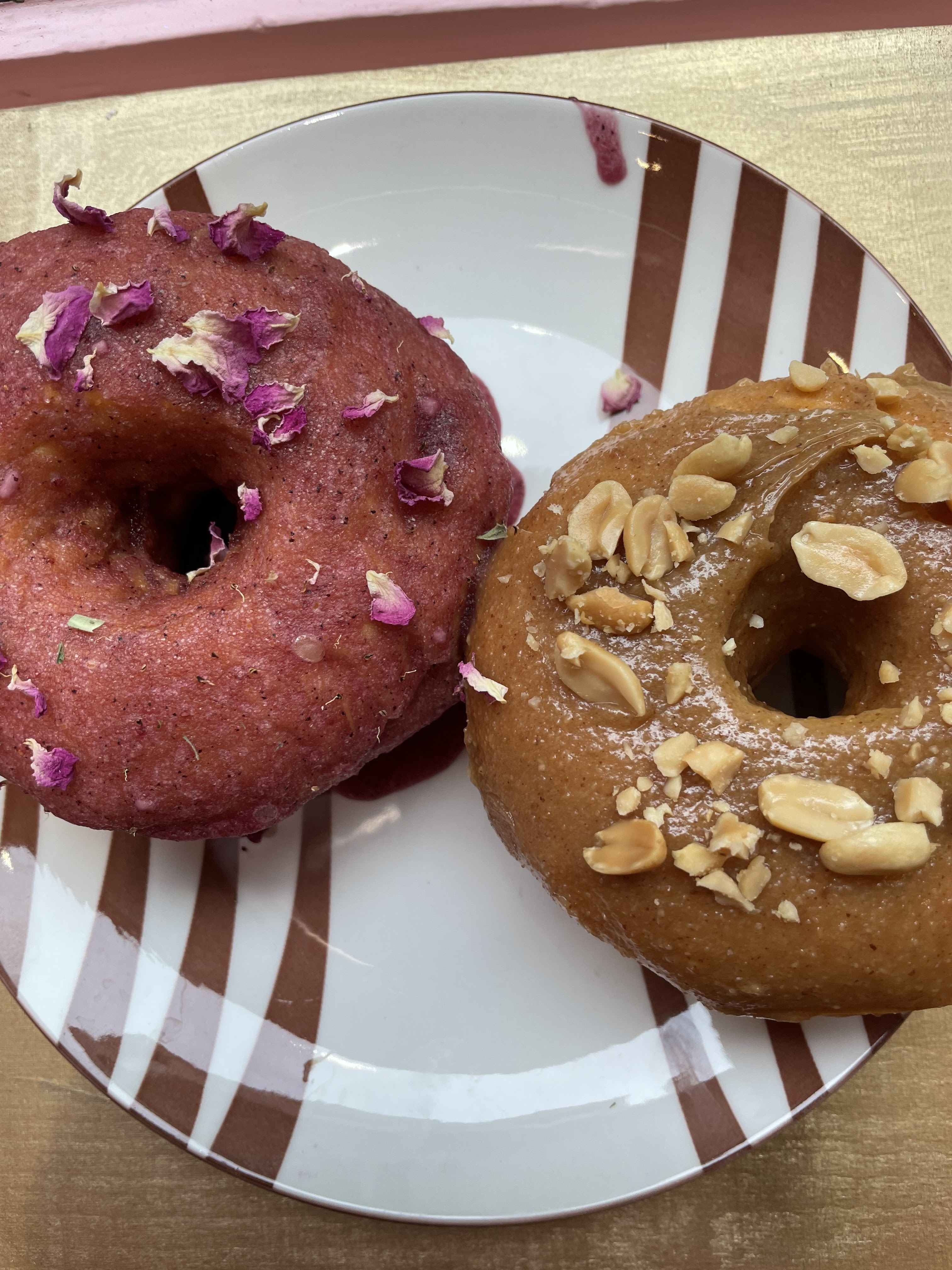 Nourriture délicieuse et vegan avec un choix de sucré et de salé. J’ai goûté un donut au beurre de cacahuètes qui était très bon, un peu brioché et sucré juste comme il faut. Les fondatrices et gérantes sont adorables, et on a le choix entre la salle du haut et la salle du bas pour déguster son festin dans un cadre hyper sweet et Instagramable. Je recommande +++++