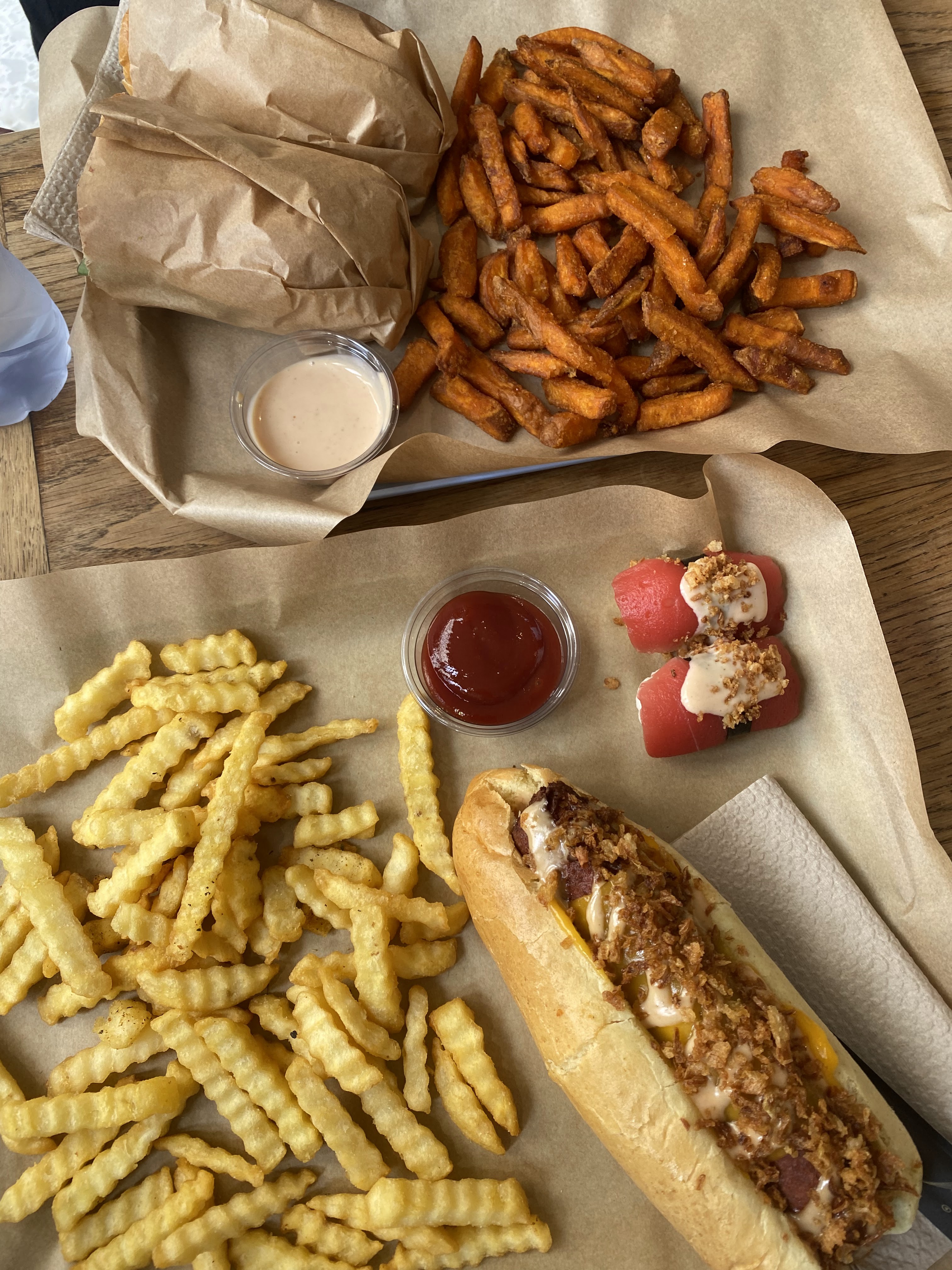 Une catastrophe, en rédigeant cet avis, j’ai l’impression de faire une blague. Famille Vegan on a pour habitude de consommer de temps en temps des petits restos Vegan à droite à gauche. Eh bien ici, j’ai vraiment eu l’impression de me faire escroquer, je vous partage des photos. Une barquette de frites de patates douces à 5€ digne d’une portion pour enfants de 5 ans, un burger à 13 € Ridiculement petit… On n’en a clairement pas pour son argent, mais quelque part tant mieux, parce que j’ai eu moins à rendre cette nuit en étant malade, et je souligne que ça ne m’arrive jamais avec la nourriture Bref, je vous conseille de passer votre chemin