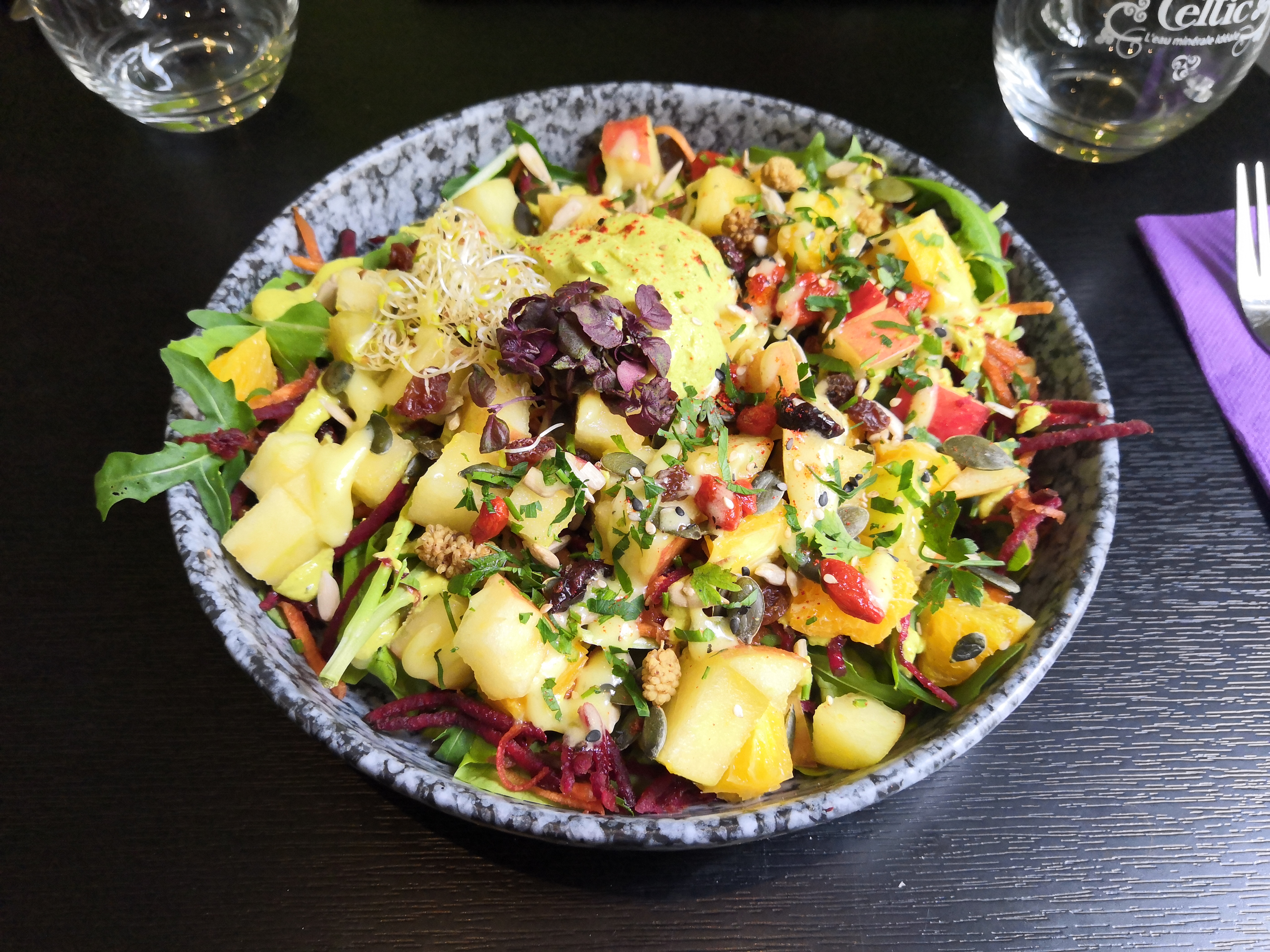 Expérience contrastée : Salade parfaite « Choucroute » végane : lamentable et on est clairement volé. Ce qu’on m’a servi ressemblait à des restes jetés dans une assiette à soupe. 1 seule tranche (tranche !) de patate en tout et pour tout et on m’a demandé un supplément si j’en voulais plus. Trois lamelles minuscules d’ersatz de viande. Rien qui n’aie la forme d’une saucisse. 3 trucs hypersalés non identifiés. Pas de moutarde disponible. Aucun visuel, garniture quasi inexistante, assiette totalement inadéquate. Bref une tromperie de bas de gamme à 15 €.