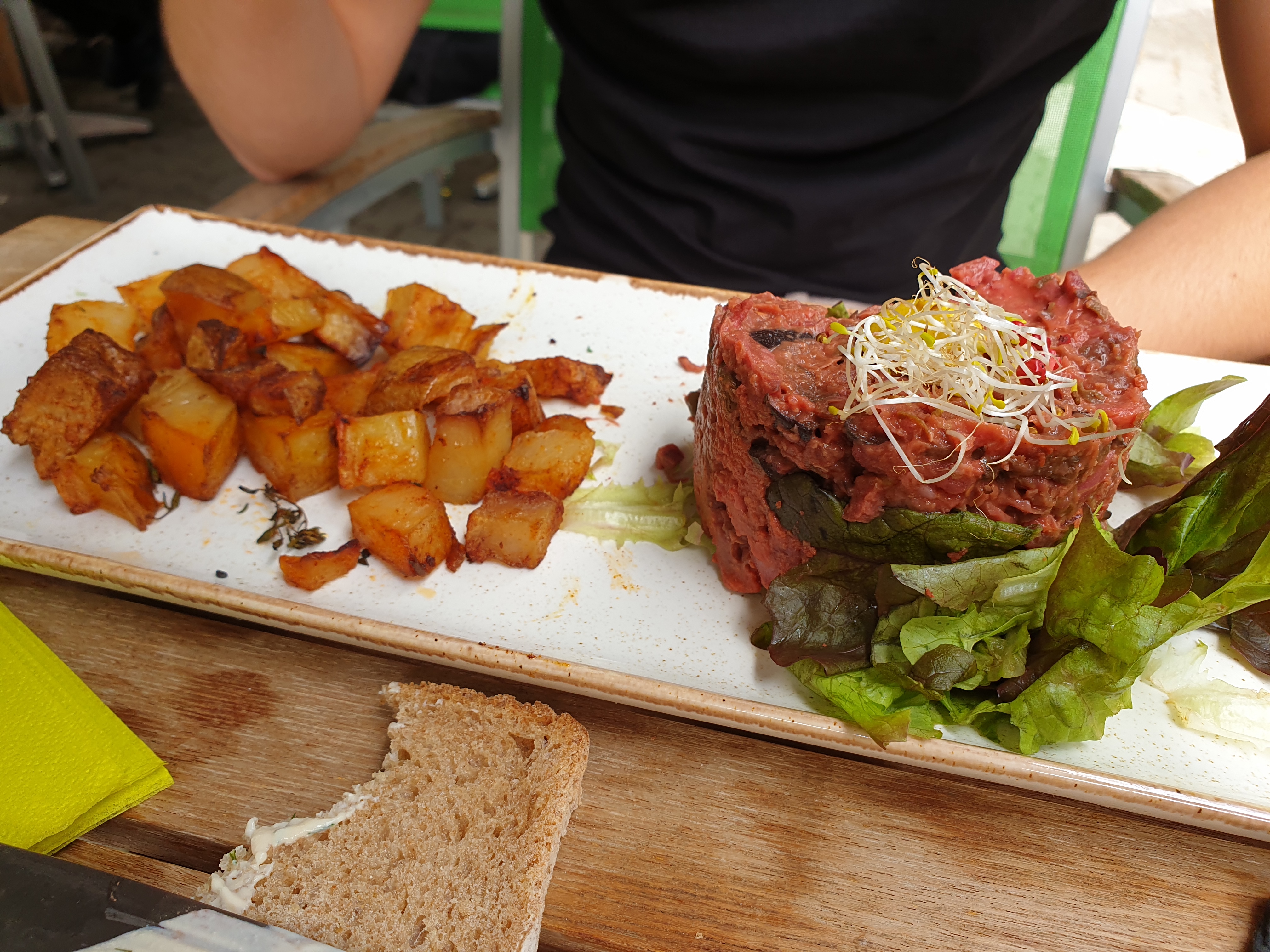 C'était vraiment délicieux ! Mon ami a pris un tartare vegan et un plateau de faumages et moi un hot dog vegan avec une boisson. Et au dessert, une tartelette aux fraises, vegan également ! Pour un resto de ce niveau entièrement bio avec des options pour les gens intolérants au gluten, je trouve que 40 euros à deux ce n'est pas si énorme que cela ! On reviendra !