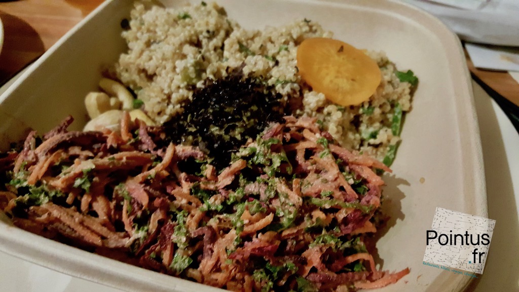 Nous y sommes allés un lundi soir à 20h30. Il y avait 3 clients. Les produits sont super bons (foccacia avocat-concombre & bowl à base de courge) : avec chacun un plat (environ 10€) nous en avions assez. Nous avons pris en plus des smoothies qui étaient eux aussi succulents. En bref, le meilleur fast-veggie que j'ai jamais fait. L' endroit est très sympa, peu de places assises néanmoins. Pourquoi pas 5 étoiles ? A cause du service : un des pires que j'ai jamais eu. On a le droit d'être un peu patraque bien sûr, mais ne pas répondre quand on dit bonsoir, ne pas regarder dans les yeux, ne pas dire merci, montrer ostensiblement ne pas être contente... c'est juste assez scandaleux. Et quand les 2 collègues ne font rien pour rattraper l'autre... Bref, dommage !