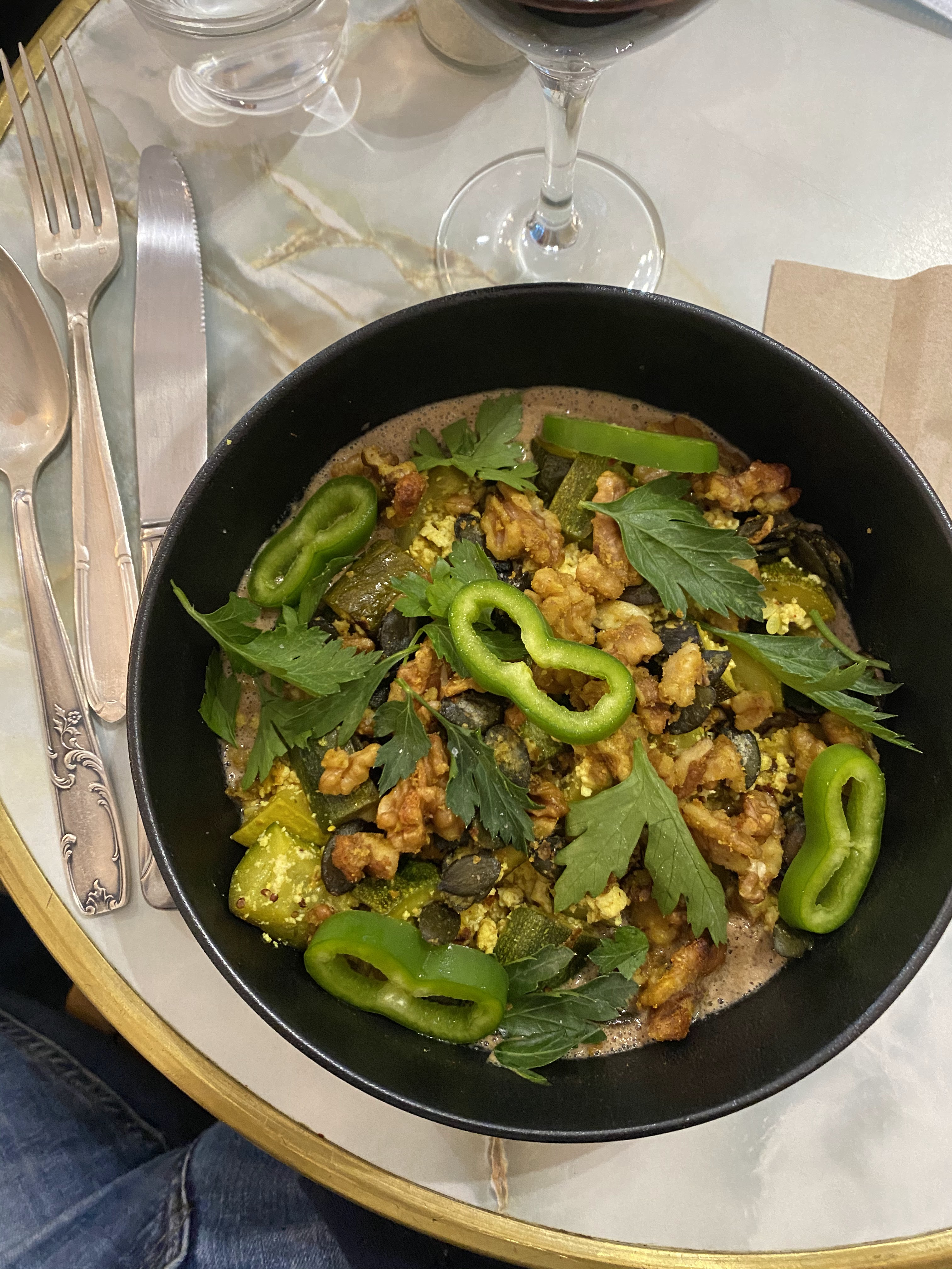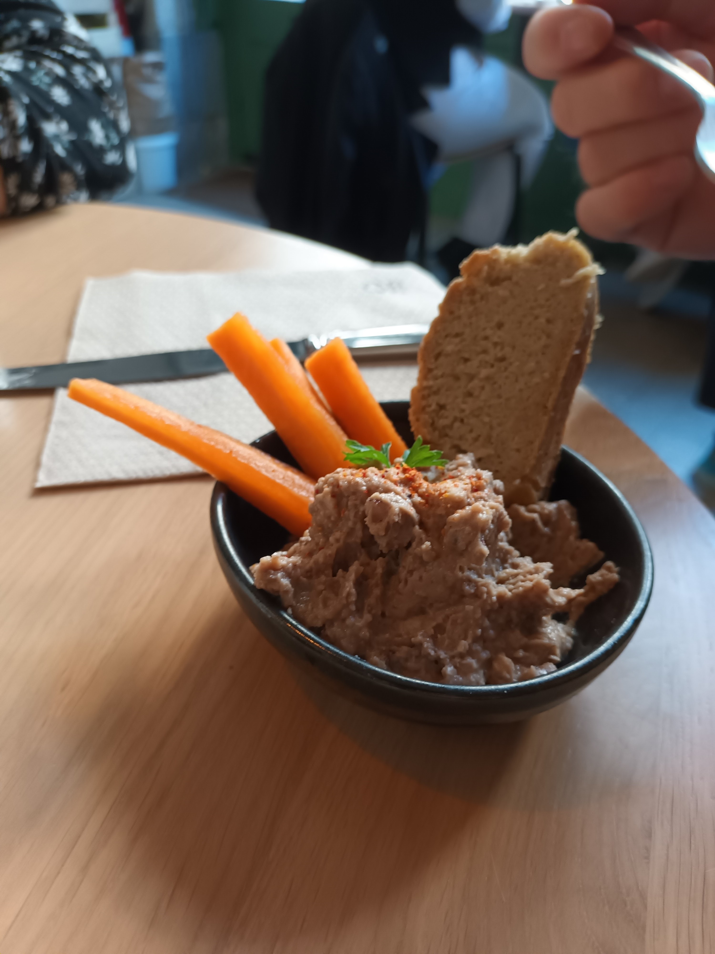 SUCCULENT ! Ayant arrêté de manger de la chaire animale depuis peu, je dois dire que ce restaurant végétalien tombe à pic (d'autant plus au Pays Basque) J'étais avec des amis donc dans l'euphorie du moment je n'ai pas pris de photos, à tort, et la seule que j'ai du plat est pixelisée mais qu'importe, mon enthousiasme sera lisible. En entrée, nous avons partagé une assiette avec Houmous, caviar, servi avec pain maison (sans gluten). En plat, je me suis régalé avec les noodles de courgettes et autres petits légumes et cacahuètes, petite sauce très goûtue, génial ! 😜 Ma femme et mes amis ont opté pour un chili sin carne (= sans viande) qu'ils ont kiffé, et qui était bien relevé ! 🔥 Pour le dessert que d'hésitation, tous avaient l'air trop bon, j'ai hésité avec le fondant chocolat courgette mais j'ai finalement pris le brownie, servi avec une sorte de ganache/crème le tour recouvert d'un disque de chocolat solide à casser avec la cuillère, mmmmm Restaurant dans coin calme, pas trop de couverts donc simple et intimiste, service souriant, friendly, déco sympa, dans la tendance, on se sent bien et on mange bien, c'était parfait ! 😁