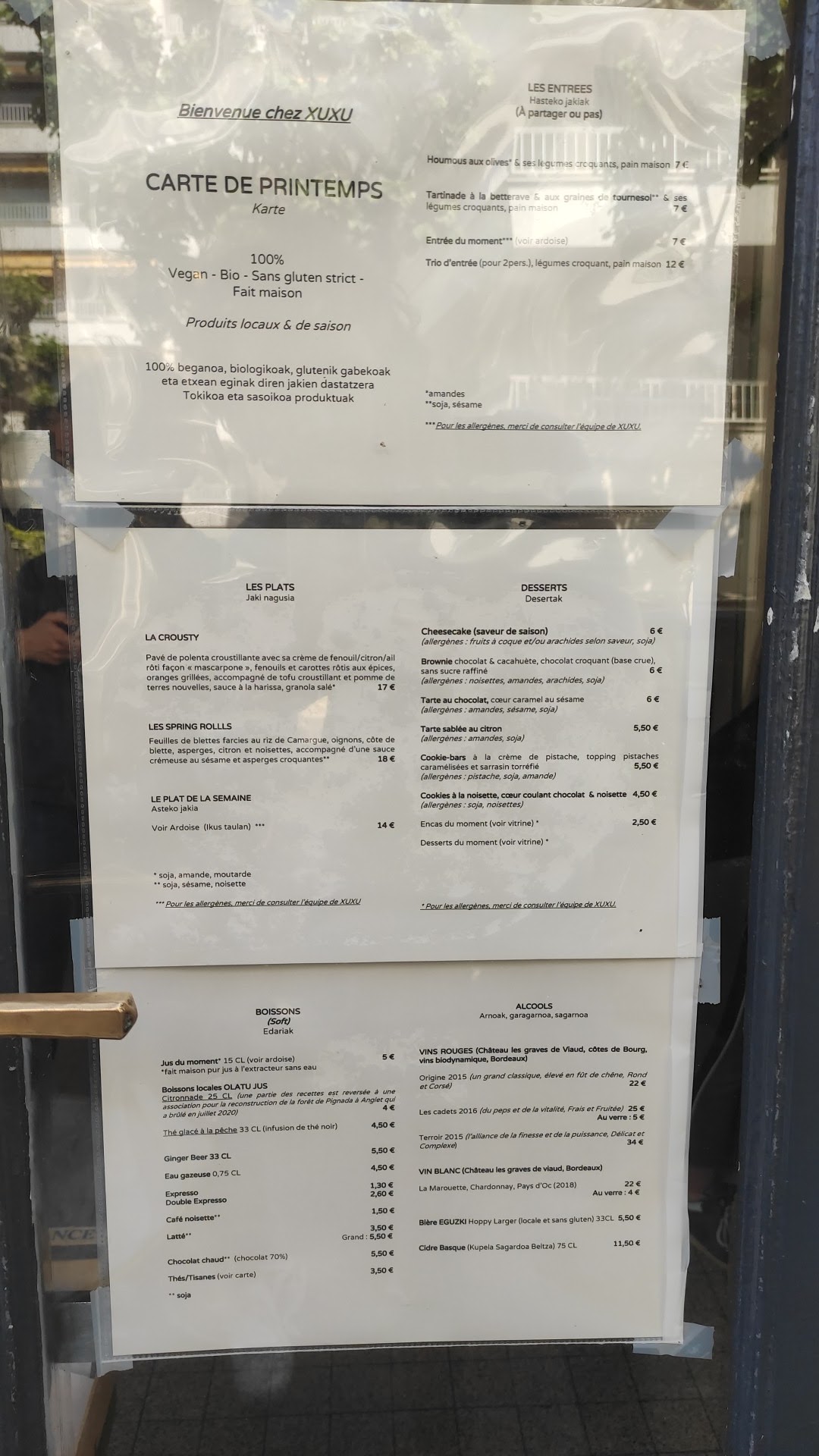 Quel bonheur d'avoir pu déjeuner chez Xuxu ! Étant coeliaque et intolérante au lactose, il n'est pas facile de trouver où manger en vacances. Tout était absolument dé-li-cieux ! On sent que tout est fait avec amour et soucis du détail. Un très grand merci de proposer des plats d'une aussi bonne qualité ! Et merci également de votre gentillesse. Nous ne manquerons pas de revenir chez nous lors de notre prochain passage à Biarritz.