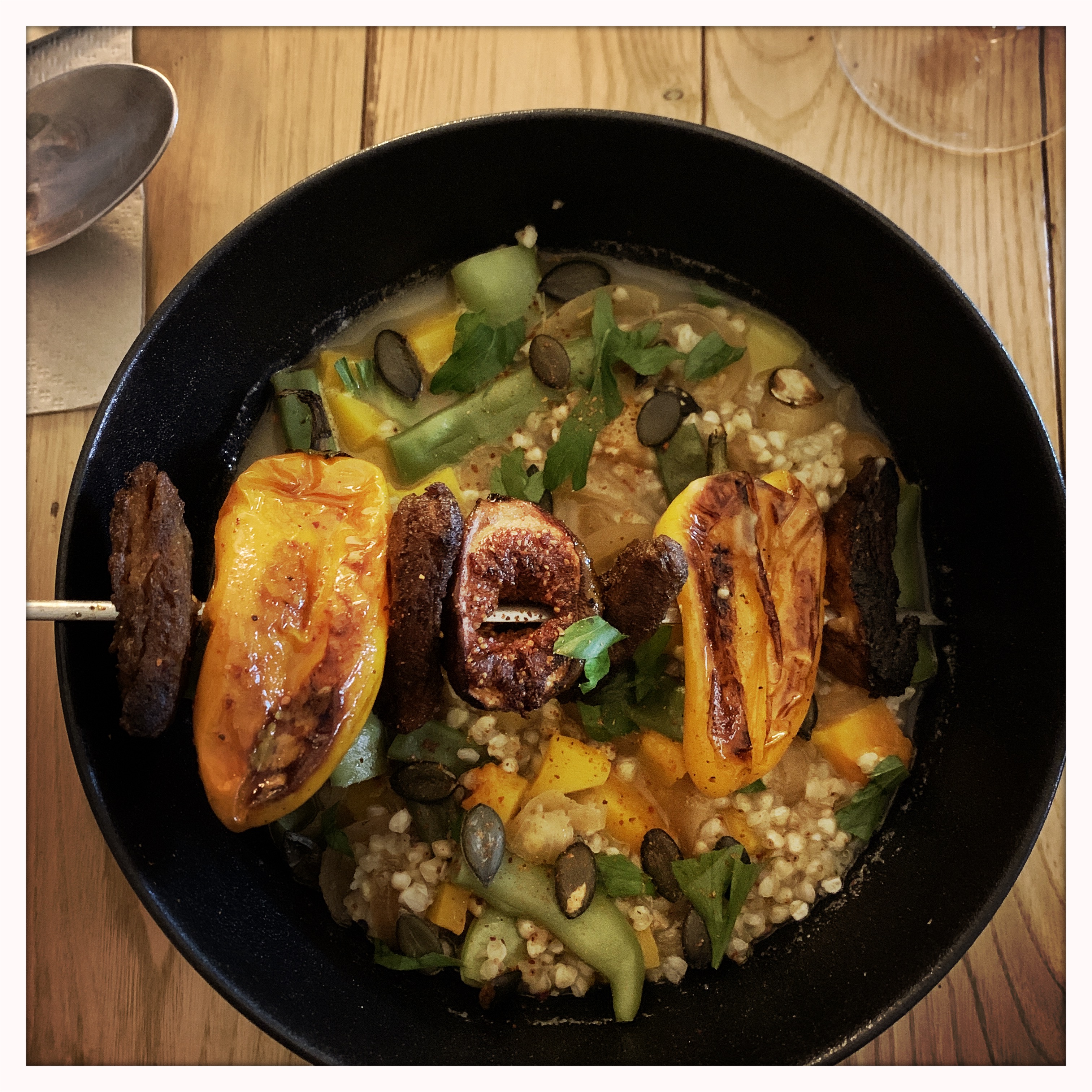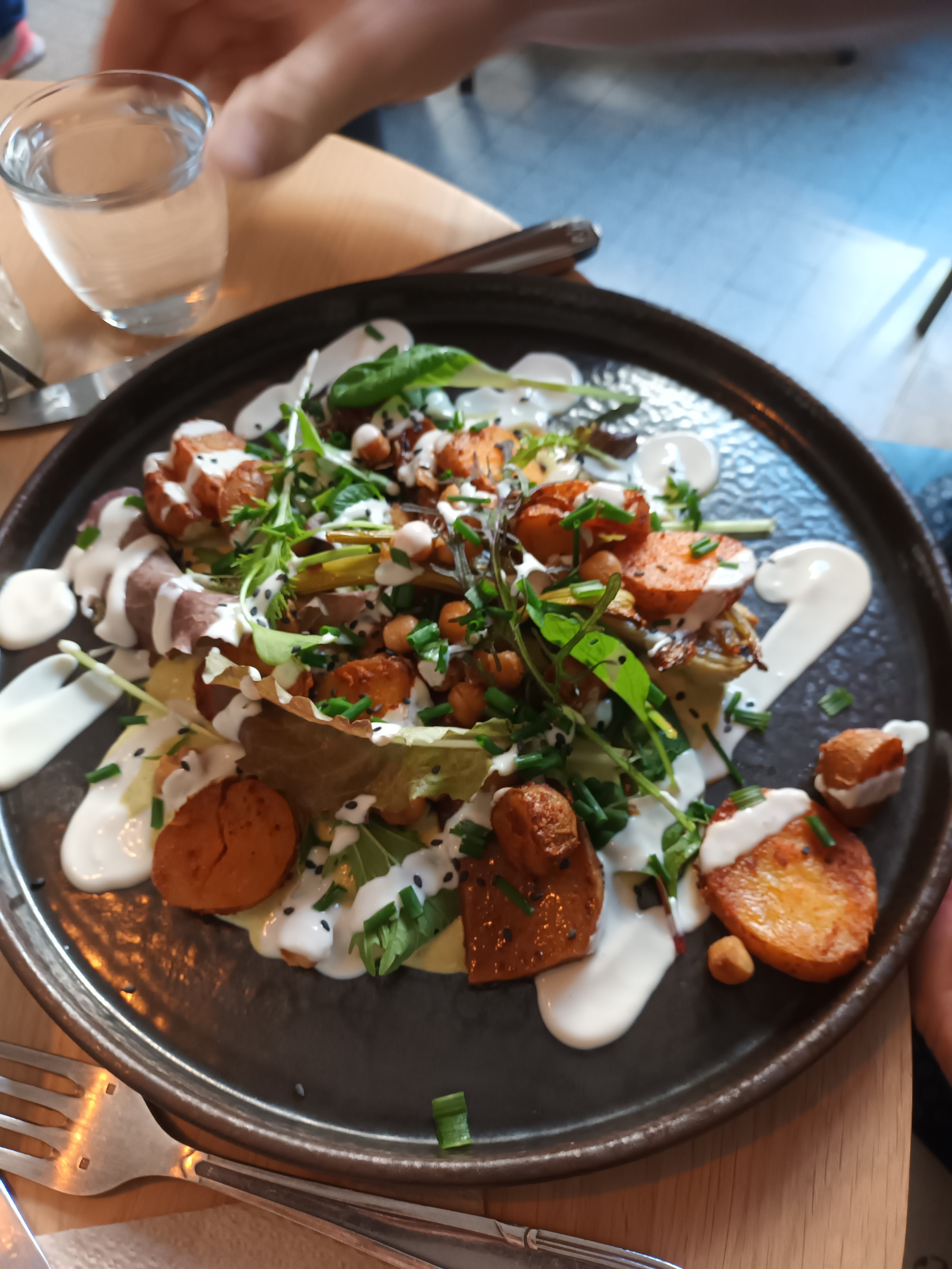 Cherchant un restaurant vegan sur Biarritz chose qui se veut plus compliqué que comprendre les règles du jeu du démineur. Je tombe sur cette belle adresse, en voyant le menu le rendez vous est pris je ne quitterai pas cette ville sans goûter à cette superbe cantine. Nous sommes arrivé, une belle place sur la petite terrasse, le lieu a l’intérieur est vraiment très cosy et cocooning. La serveuse est un soleil, nous avons pris le kebab vegan et la polenta crémeuse. C’est une réussite pour les deux plats, plein de saveurs, de jeux de texture. À la couleur de la tomate je devine déjà les produits de saison et locaux d’un petit producteur et le goût le confirmera quelques minutes plus tard. Les quantités sont justes parfaites. Nous sommes sorties : repus, conquis et heureux. Le prix est juste par rapport à la qualité, au service et à la recherche culinaire de ses plats. Une justesse réussite, il me tarde de revenir dans quelques mois pour revenir déguster votre cuisine. Si je veux faire ma française : j’aurai cuit un poil plus les potatoes pour plus de fondant à cœur. Merci à vous pour ce bon moment de partage et de saveur !